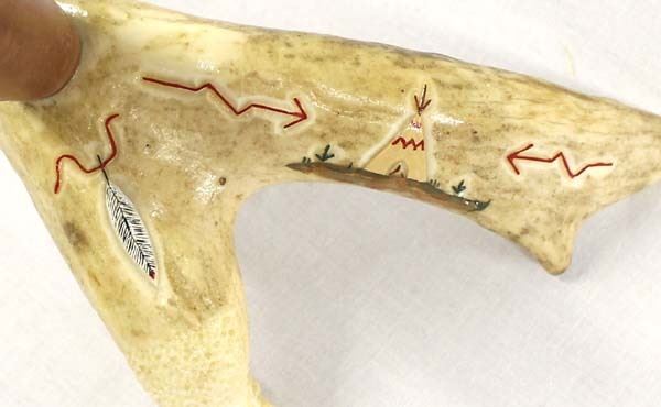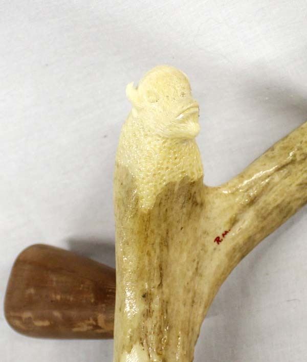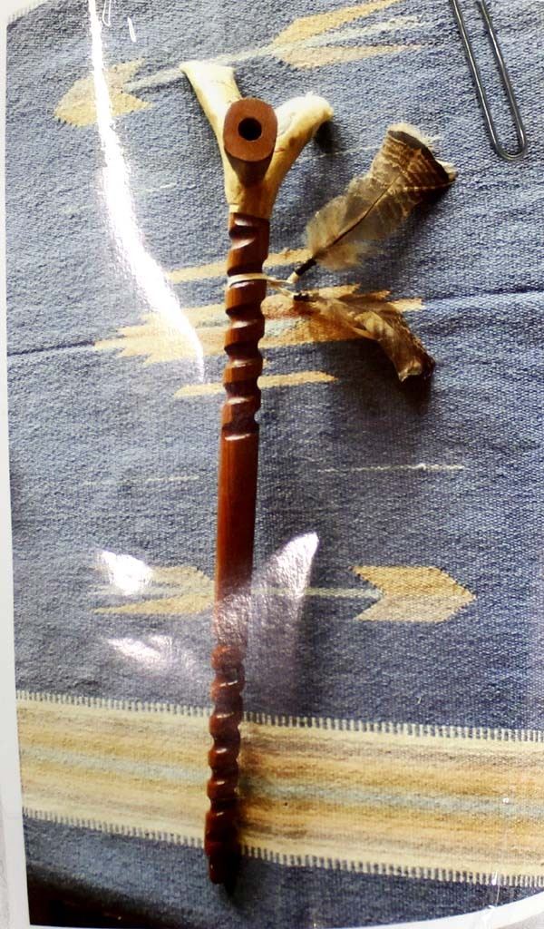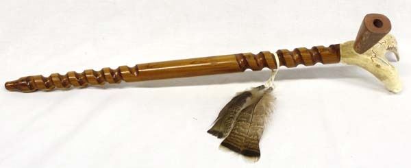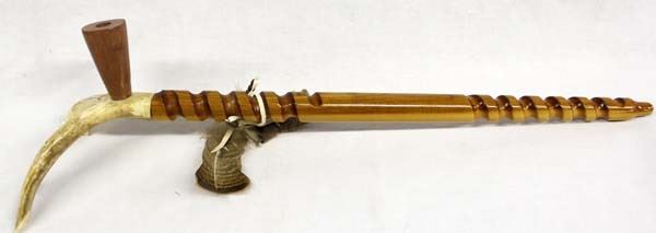 Native American Navajo Carved Antler & Catlinite Peace Pipe, the stem is carved spiraled cedar, the bowl is catlinite, and the end is a carved antler with a buffalo carved on one tine, carved embellishments of a tipi, broken arrows, and feather on the other tine, the leather tie is decorated with 2 feathers and brass pony beads, a phenomenal work of art, the artist's initials R.M. are carved on the bottom