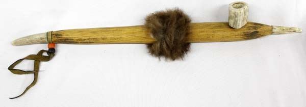 Native American Carved Antler and Wood Pipe, measures 2'' x 14'' x 1'', antler mouthpiece, antler bowl, and carved antler eagle end, embellished with what appears to be buffalo fur, leather tie, and pony beads, wood stem