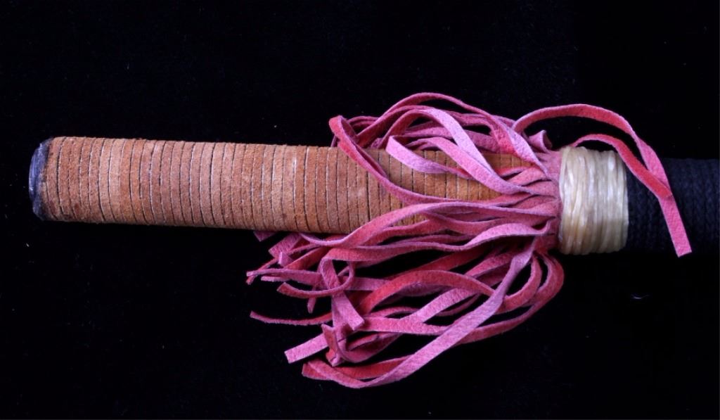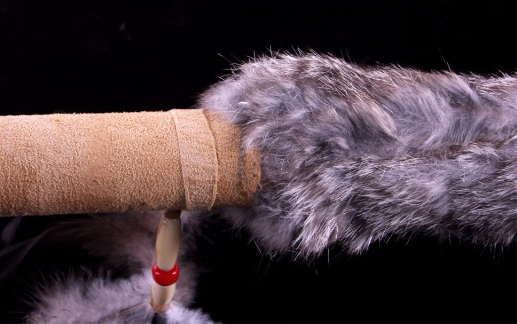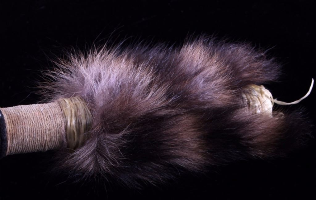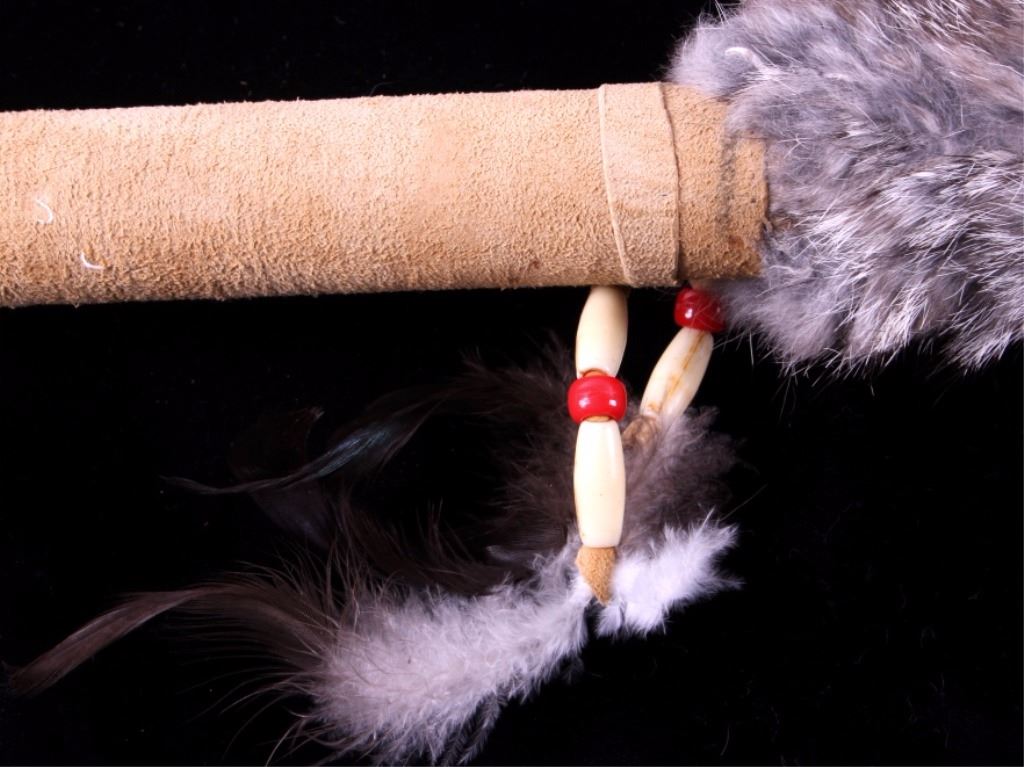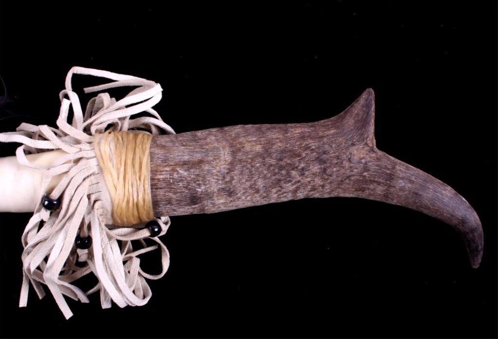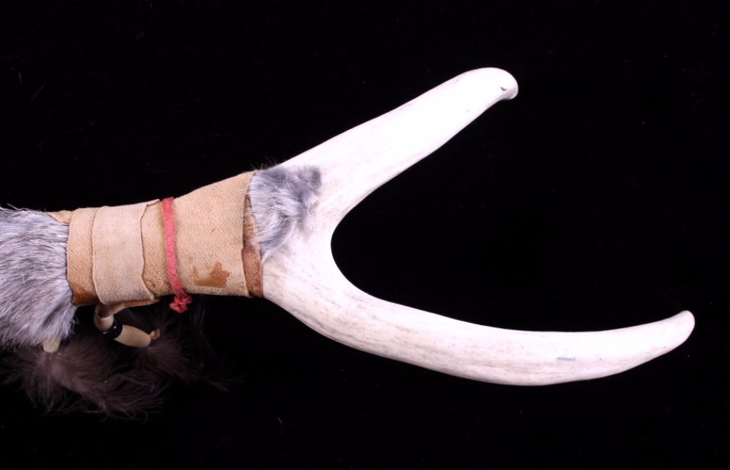 This is a collection of three Native American  ceremonial dance sticks. Each of the sticks  features a deer or antelope horn and is  adorned with beads, animal fur, and leather  fringes. They are all in very good condition. The largest one measures 32" long.