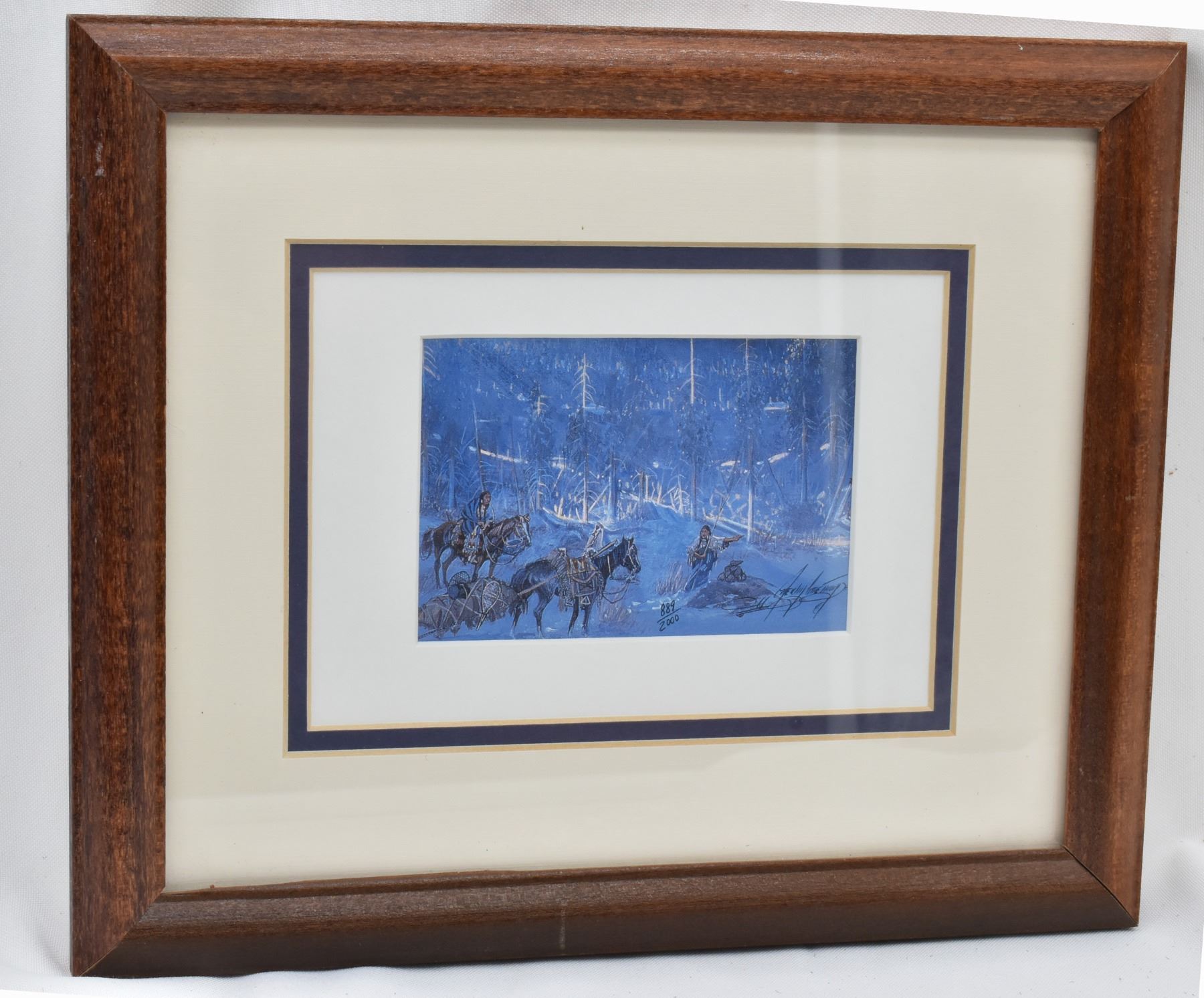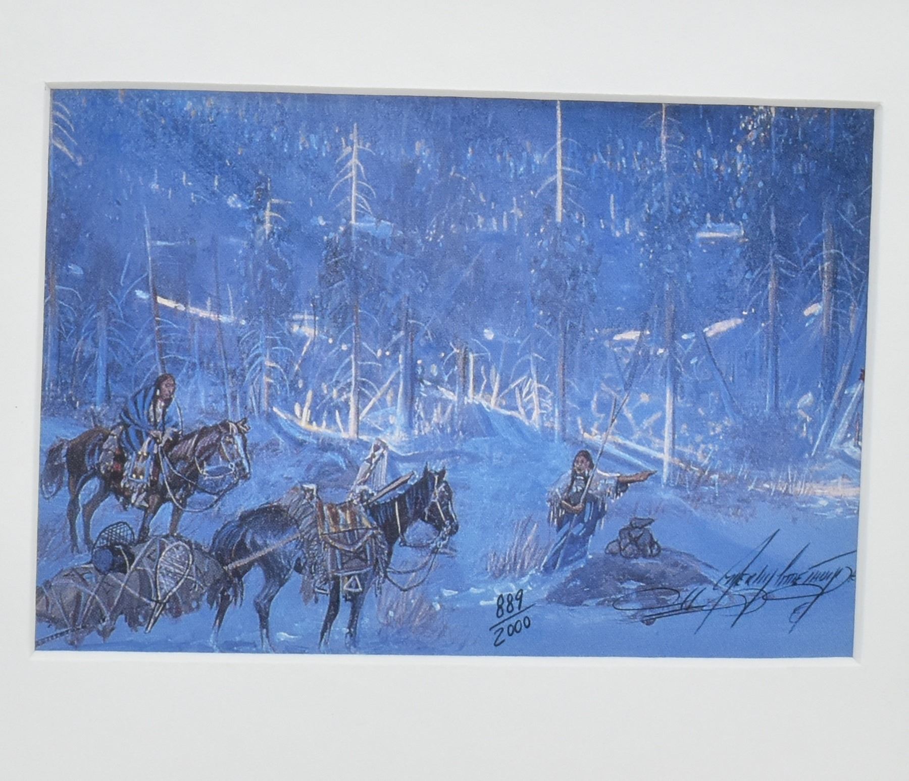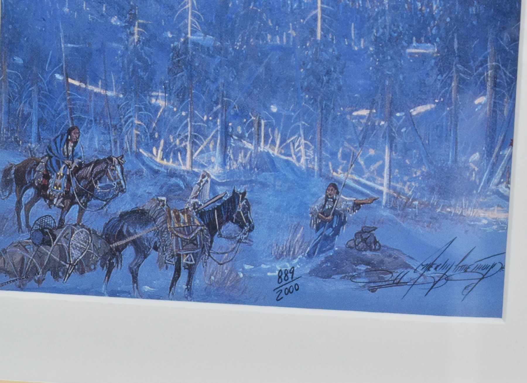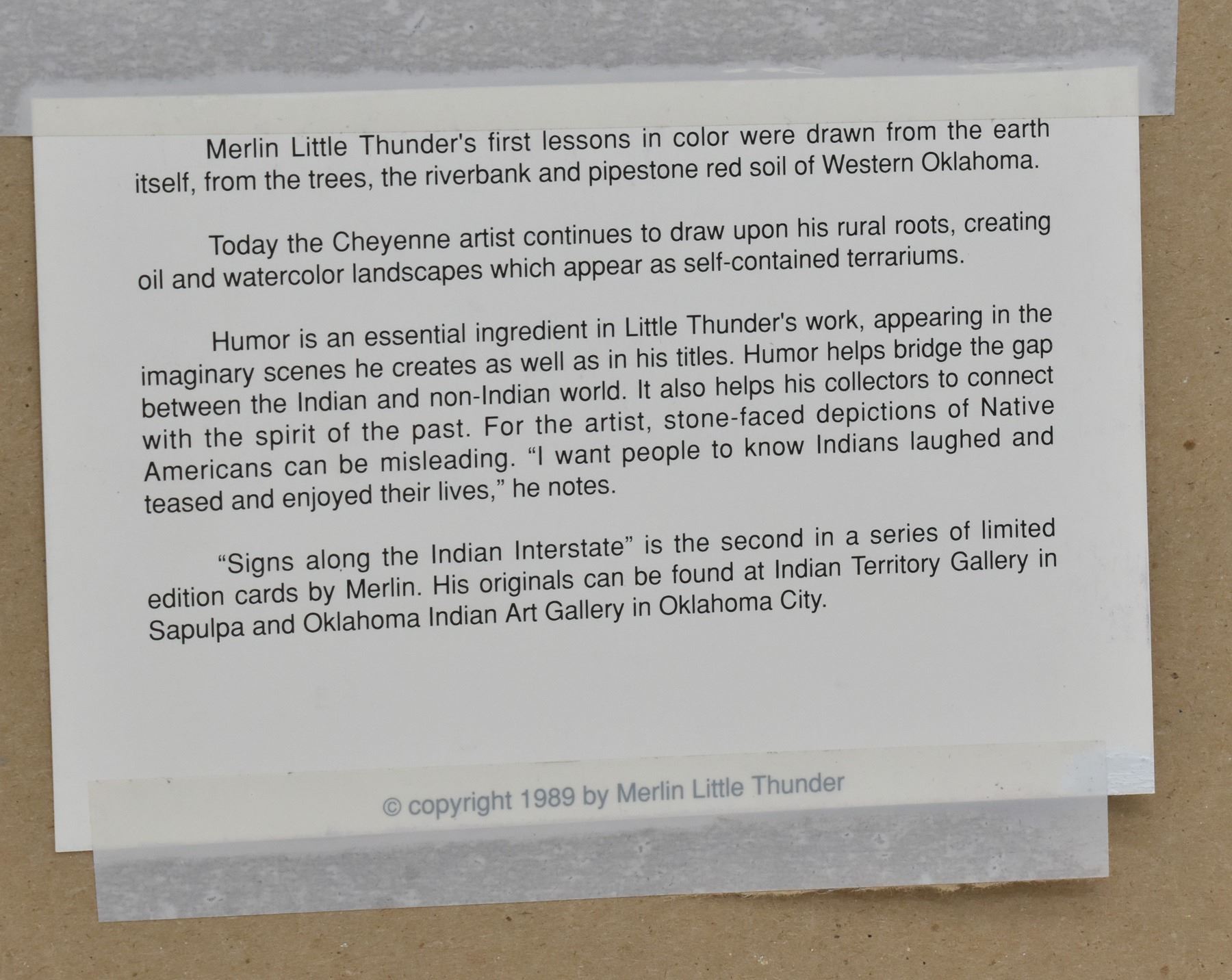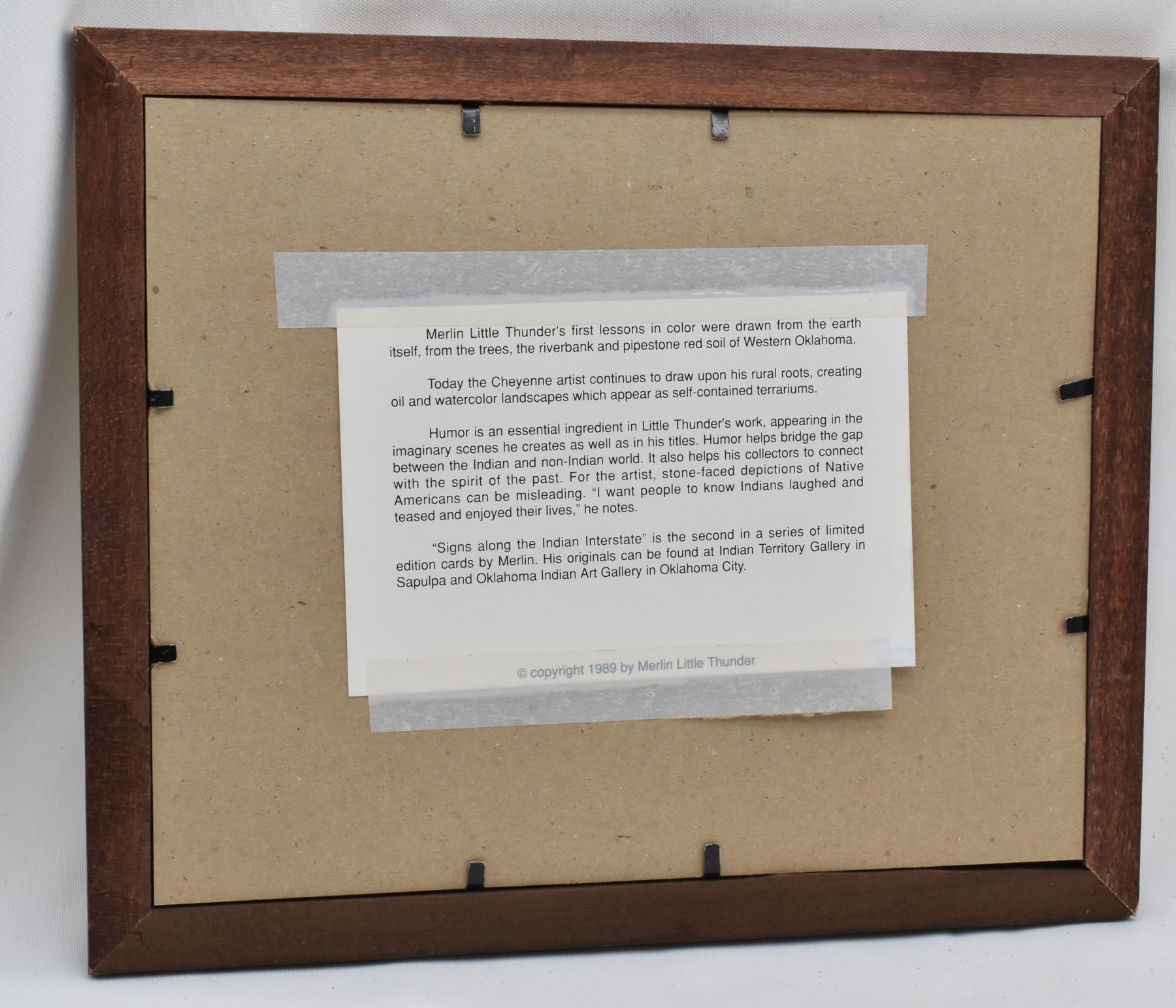 Native American Cheyenne Framed Print by Merlin Little Thunder, triple matted and under glass, hand signed and numbered 889/2000, FYI: "Merlin Little Thunder (b. 1956) is a Southern Cheyenne artist living in Tulsa, Oklahoma. His paintings express the history, people and the land in a narrative, representational style, especially from the perspective of the Southern Cheyenne people. He is well known for his miniature paintings, bright colors, and for the incorporation of humor into his work."