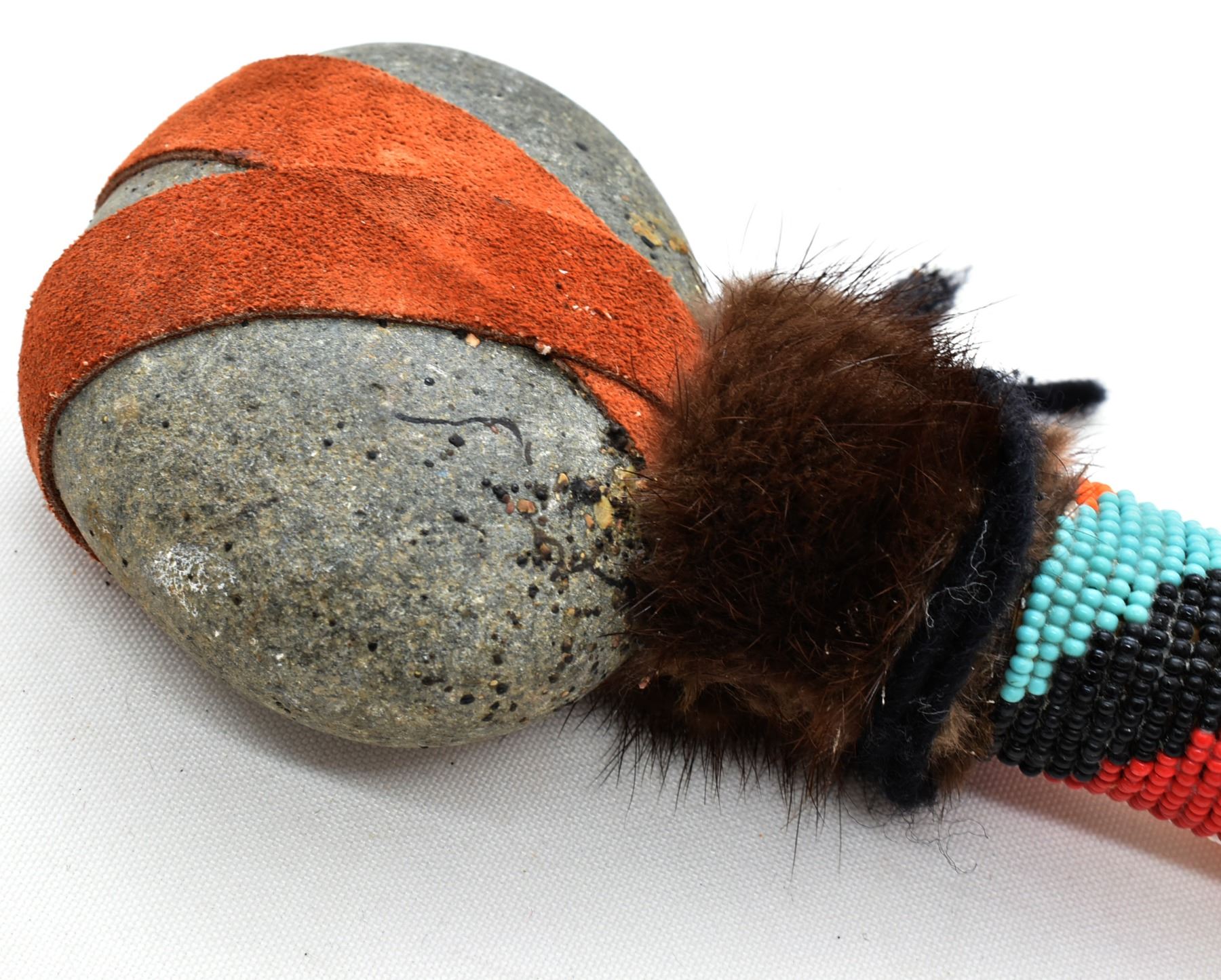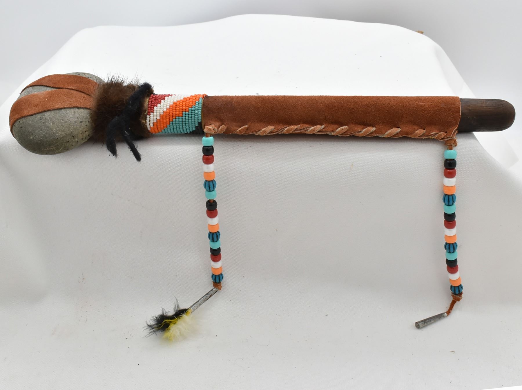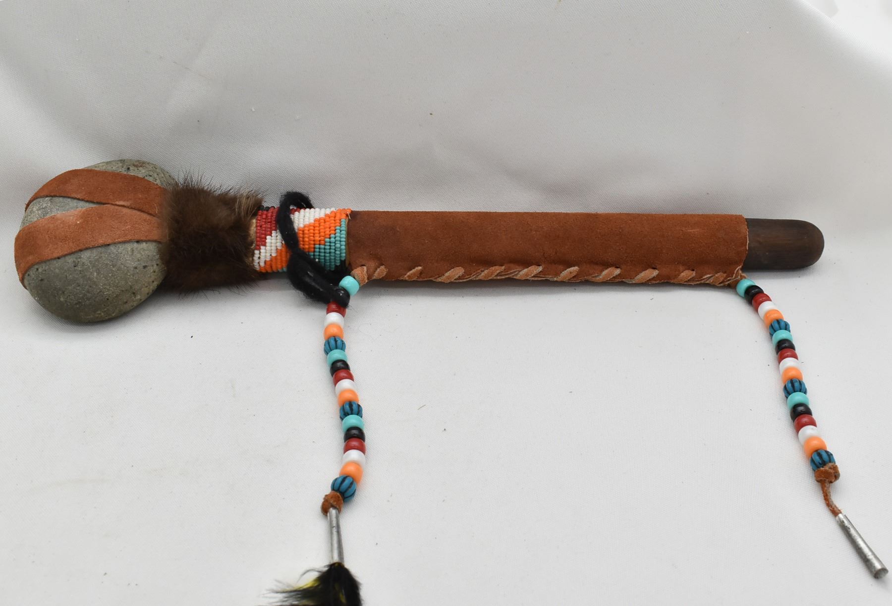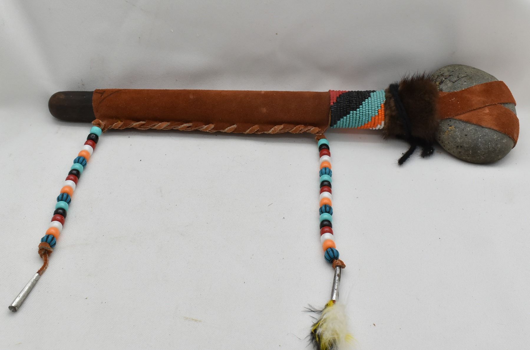 Native American Cheyenne Stone Club, measures 15''L x 3.5''W, leather wrapped wood handle, embellished with mink fur, beadwork, feathers, and tin cone, artist's initials L.T. inside of a tipi on leather near end of handle