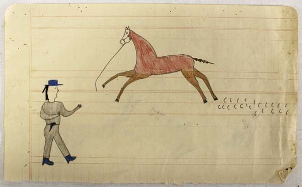 Native American Child's Ledger Art, measures 7'' x 12'', horses on one side and Native man and horse on the opposite side, on an old piece of ledger paper