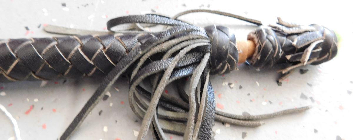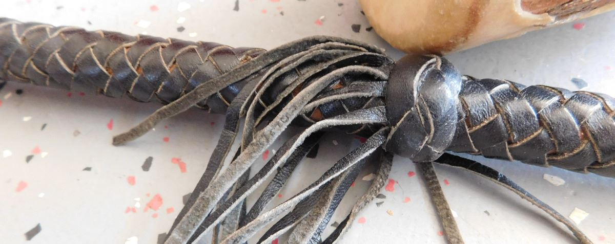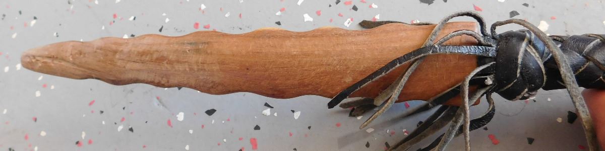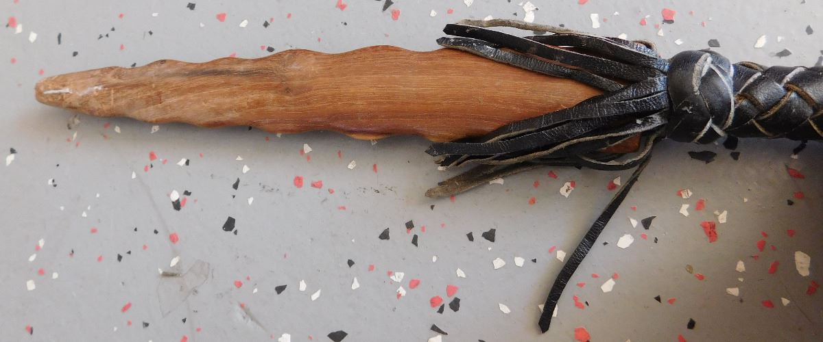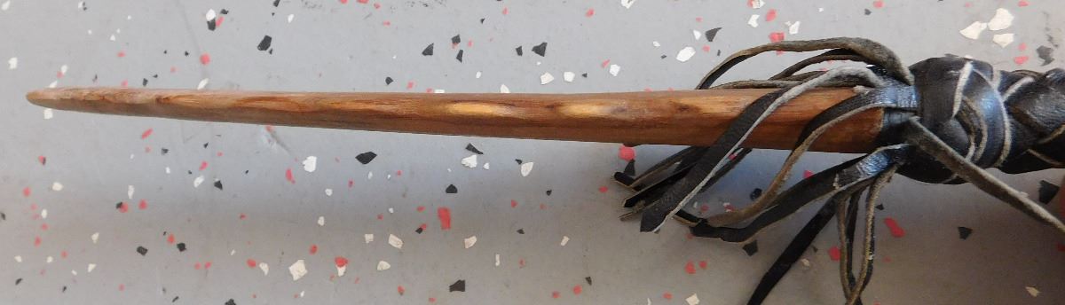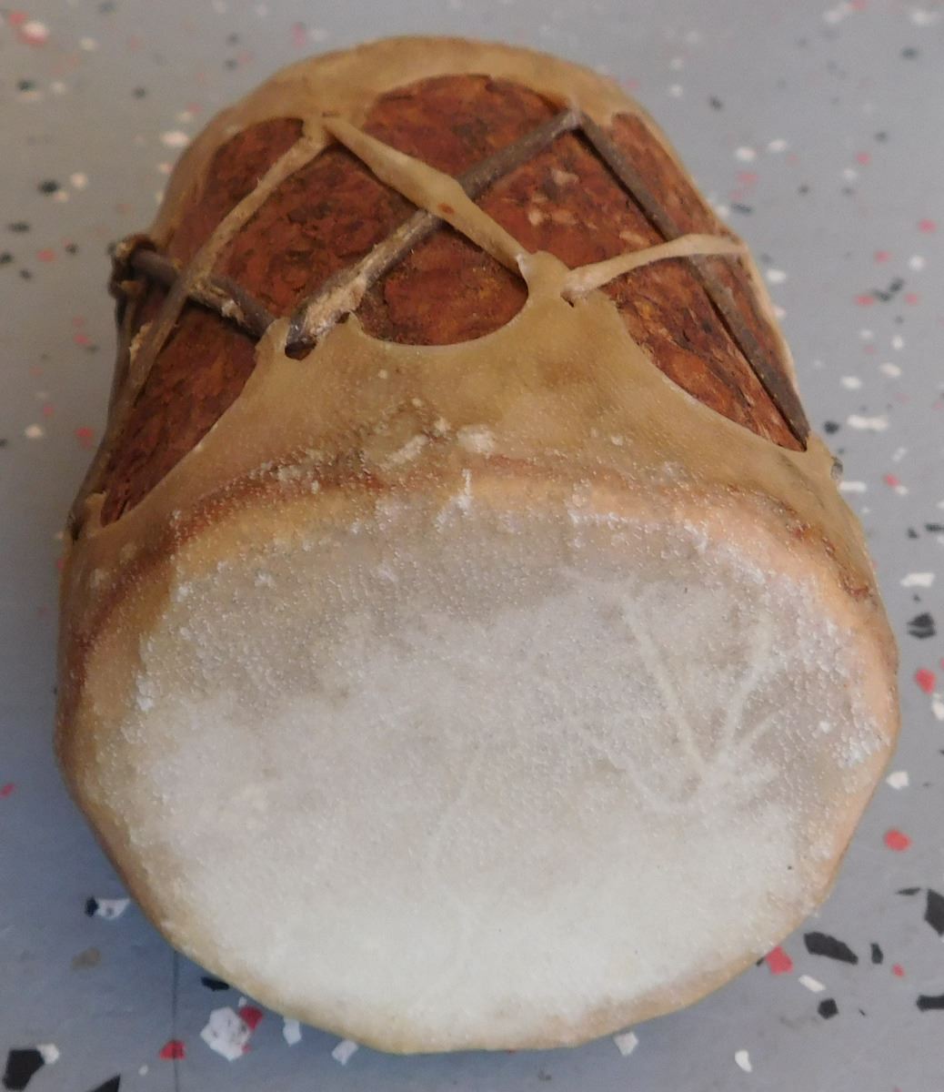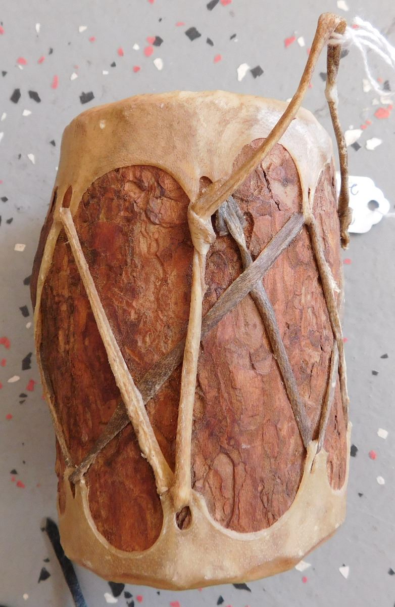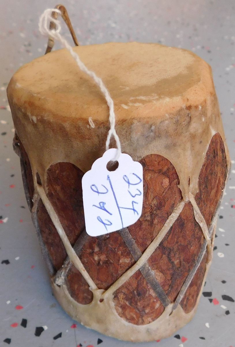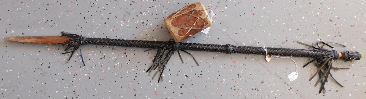 Native American Child's Spear & Drum, circa 1950s. Made of wood and leather, the spear is 40" long and the drum is 4" tall. From Oklahoma. Condition: Some wear, see images. Shipping: $27.50.