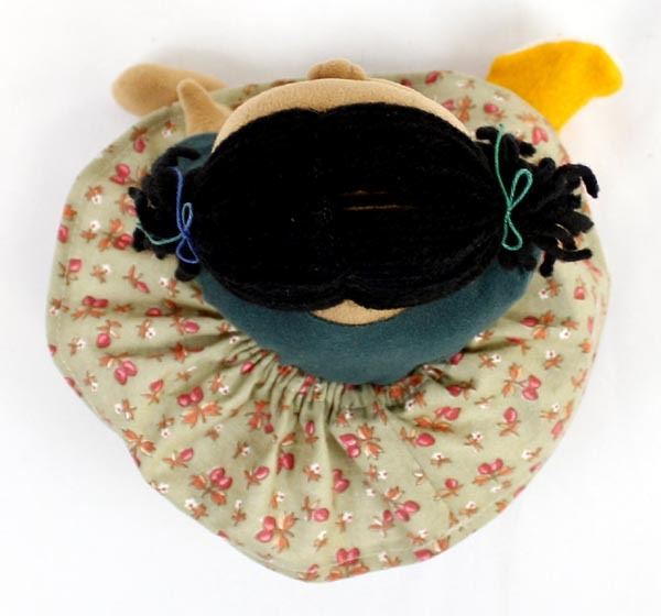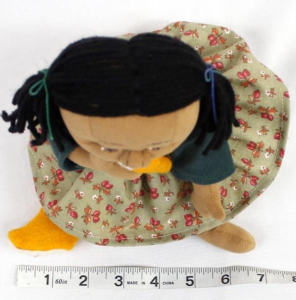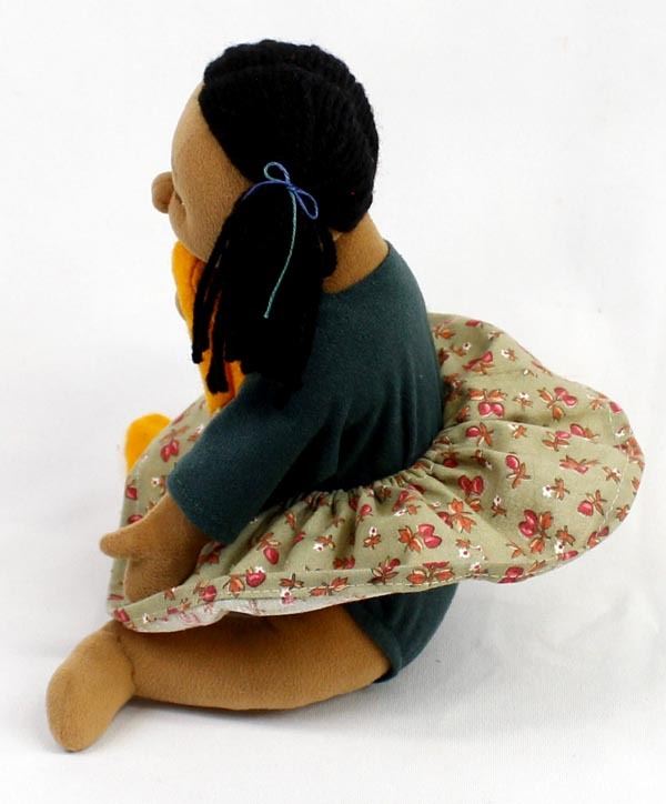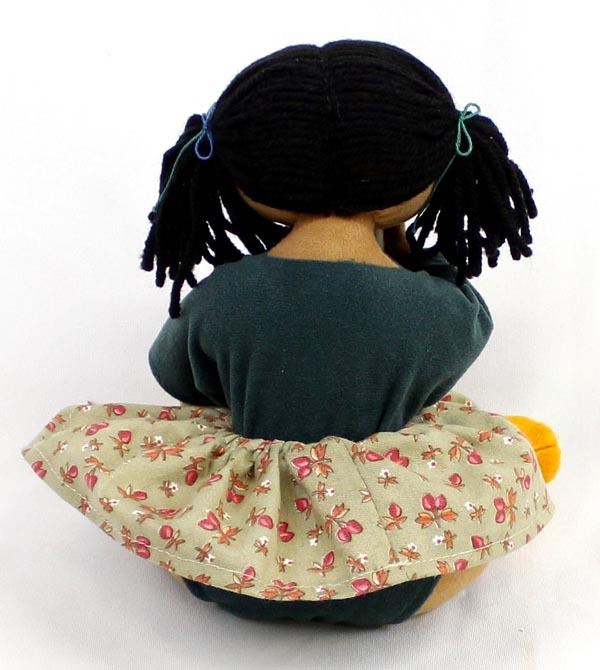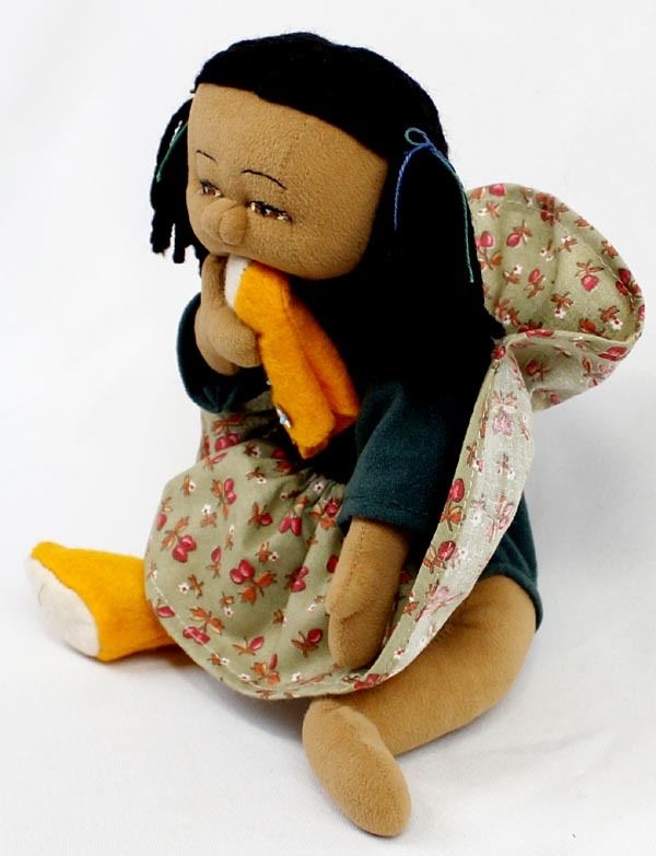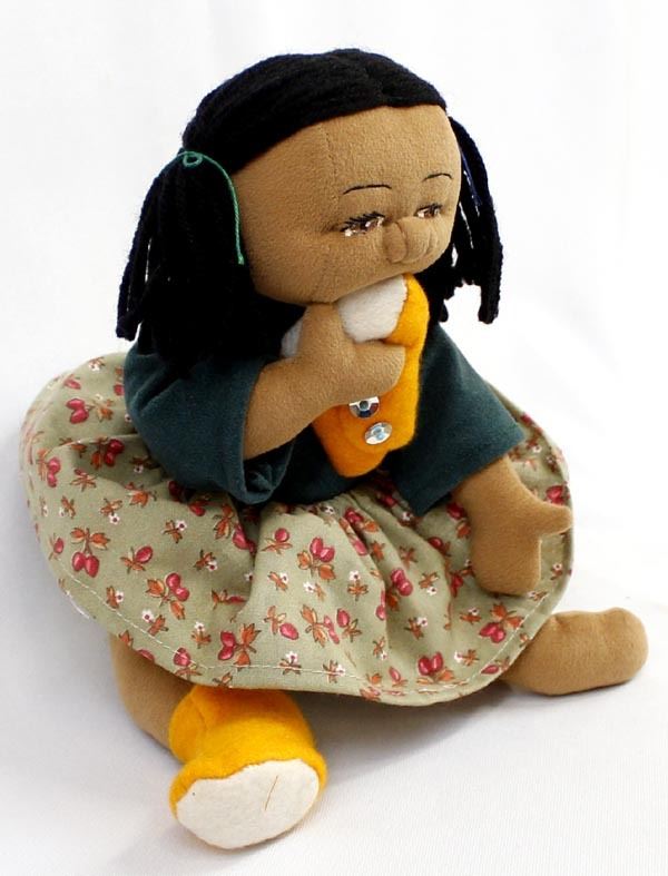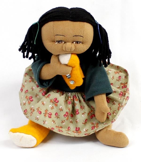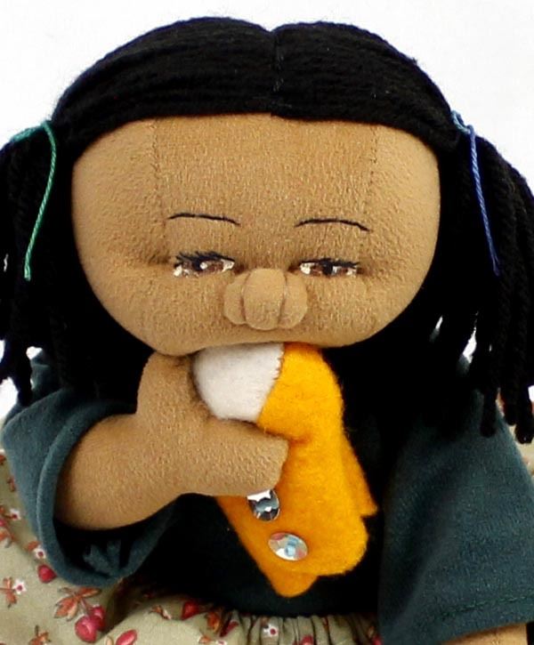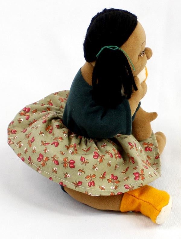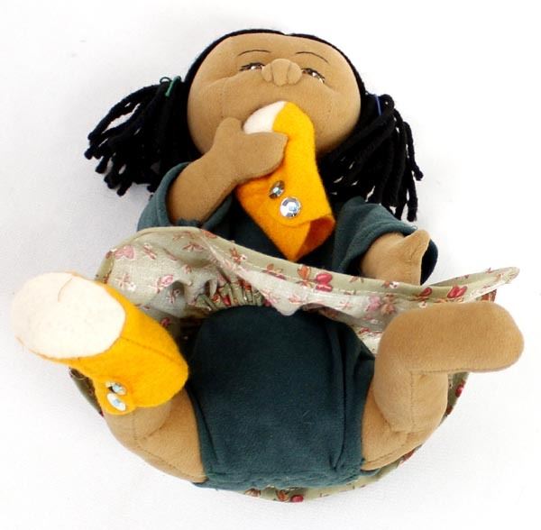 Native American Cloth Doll in the Throw of a Tantrum Fit, chewing on her new Yellow Mocassins, measures 6 1/2 x 8''W