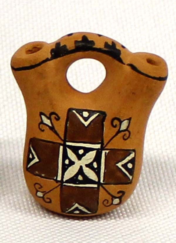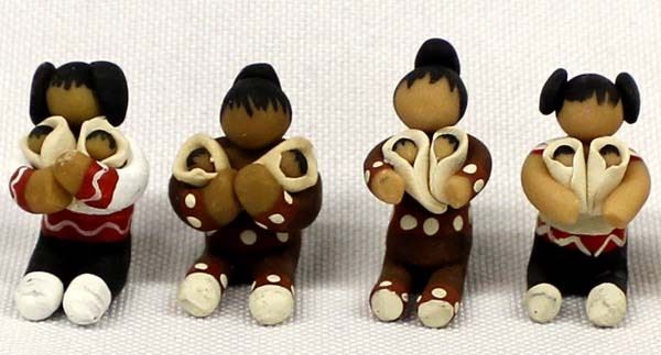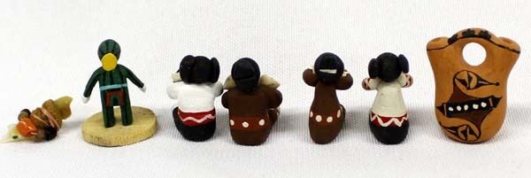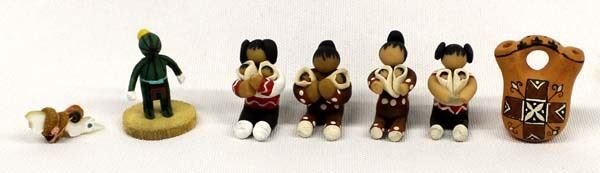 Native American Collectible Miniatures, largest measures .5'' x 1'', includes 4 clay Native American Women figures holding babies, carved mother of pearl wolf fetish, Pottery Wedding Vase, and Squash Man Kachina by James Tewayguna