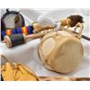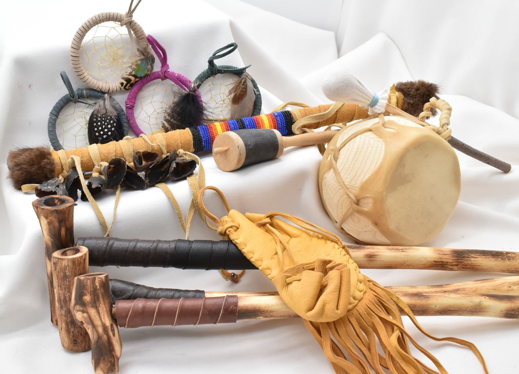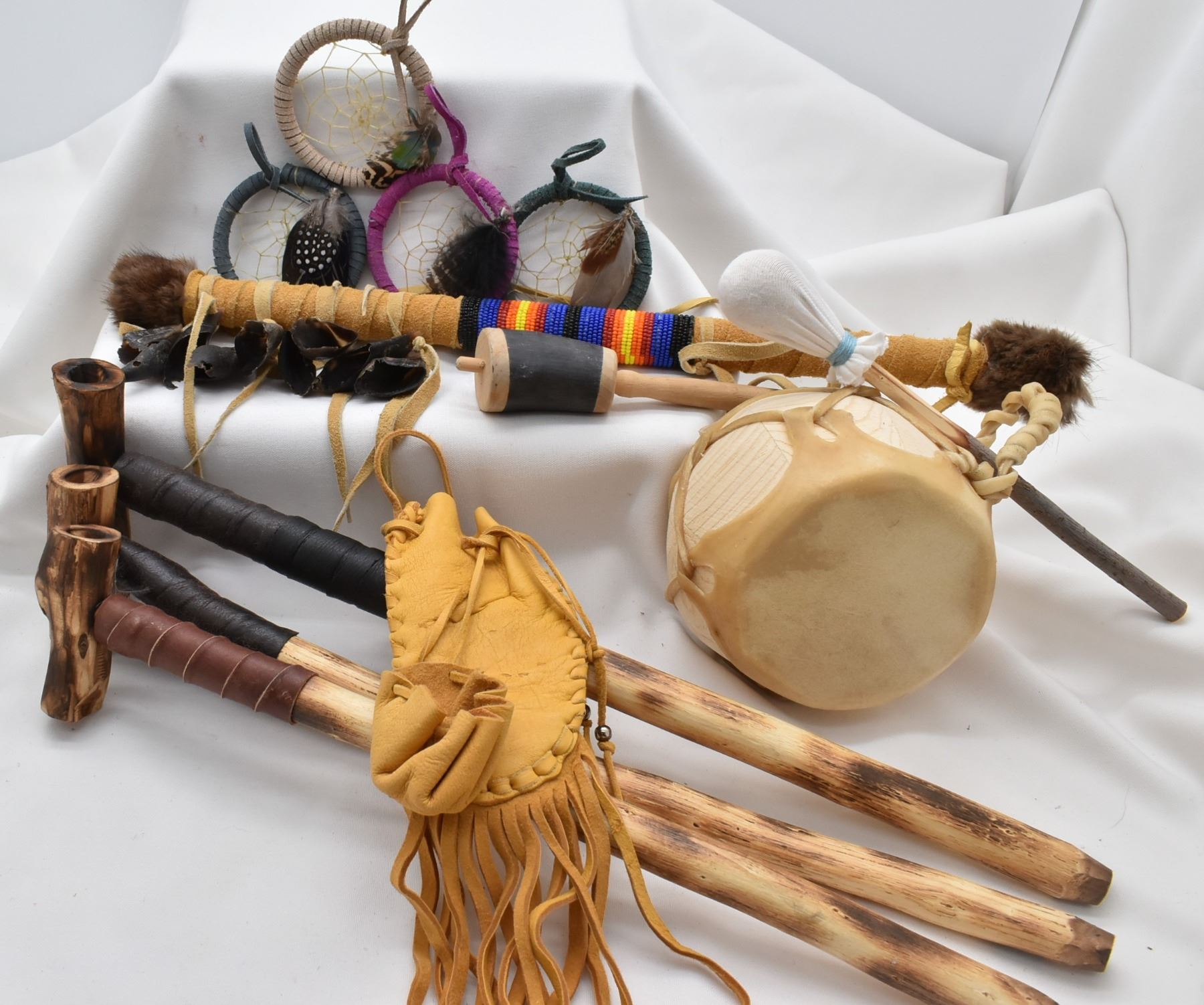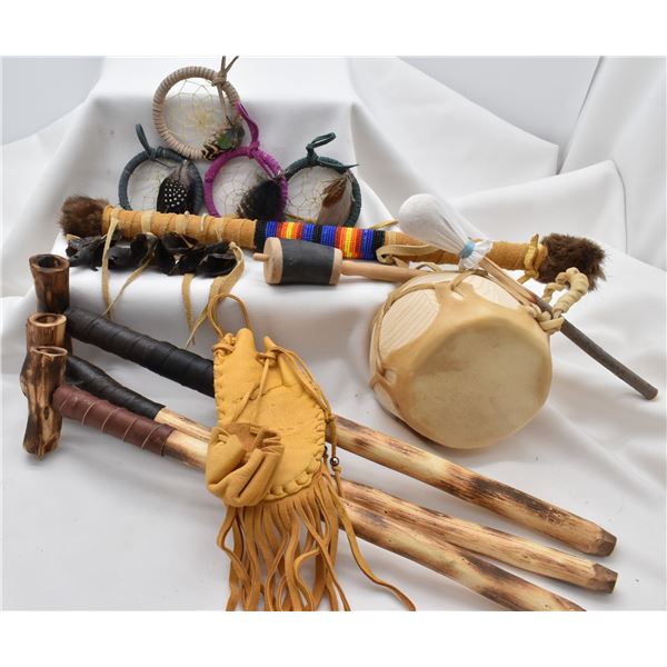 Native American Collectibles, includes 1. Cochiti Hide and Wood Drum w/ Beater 2. Three Cheyenne Cedar Bowl Pipes 3. Navajo Leather Wrapped Dance Wand, embellished with fur and deer hooves, longest measuring 18''L 5. Four Picurus Pueblo Leather Wrapped Dream Catchers by Tom Gray Elk Rael 6. Two Chippewa Leather Pouches, drawstring closures 7. Six Nations Cow Horn and Wood Rattle DW 165 Shipping $18.00