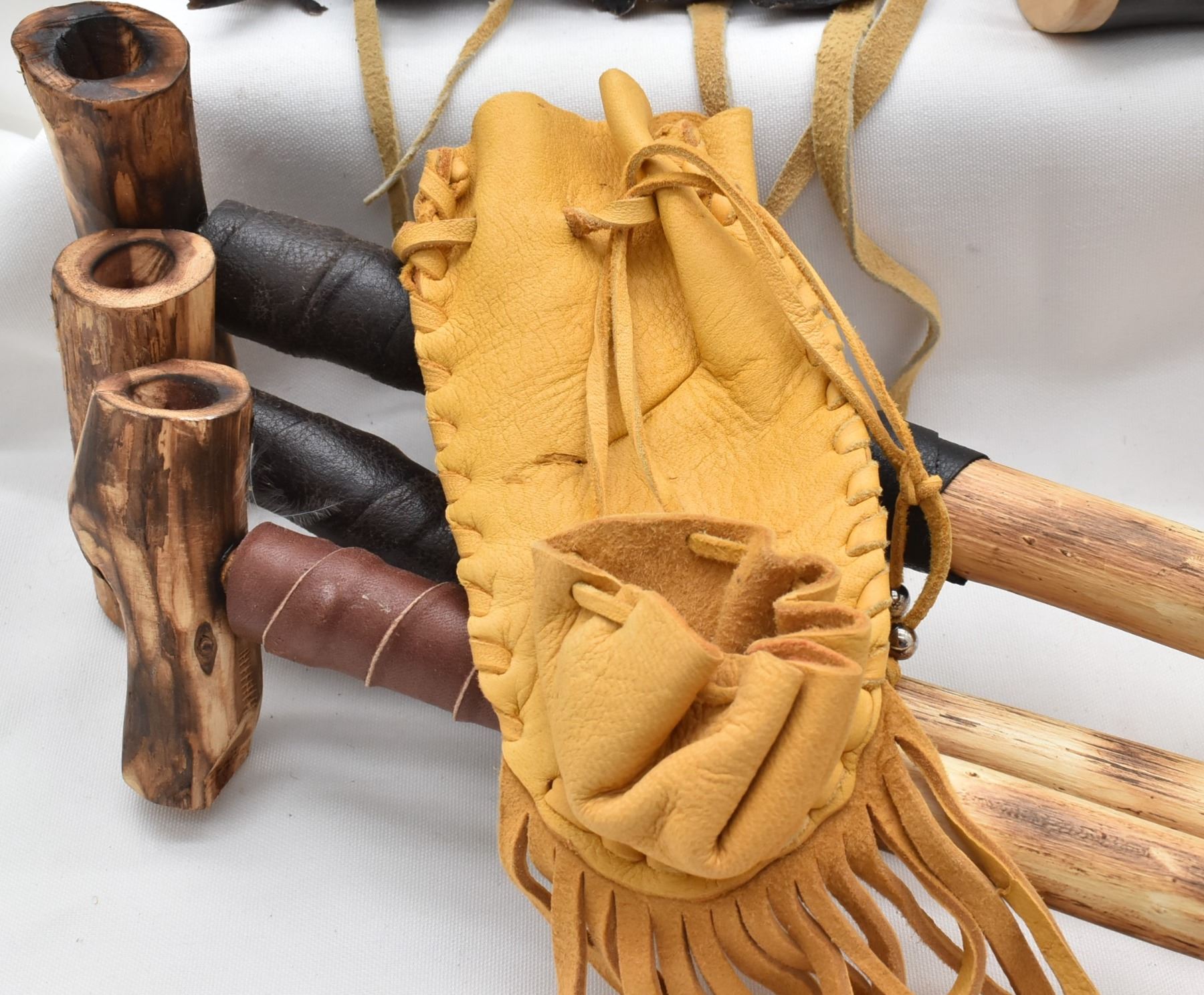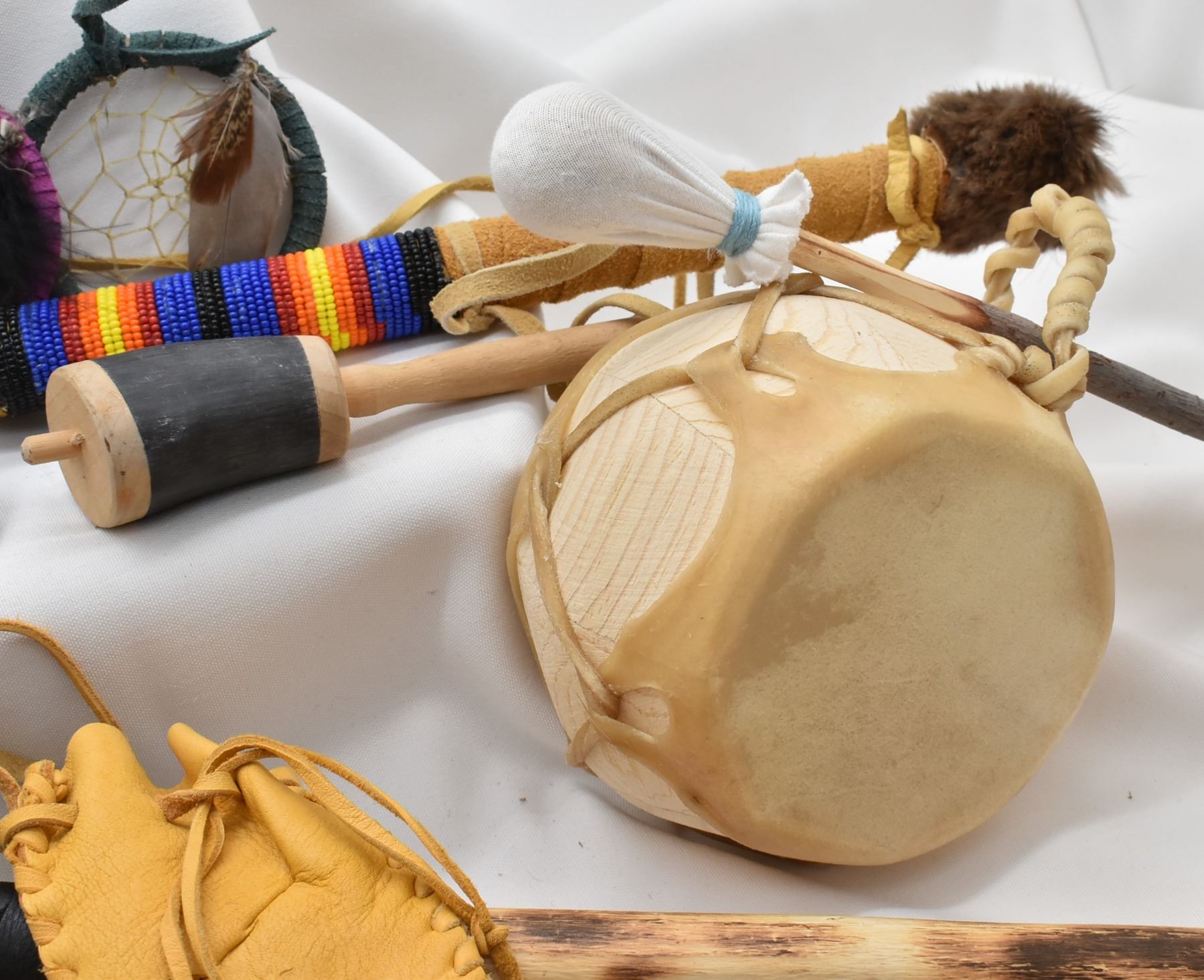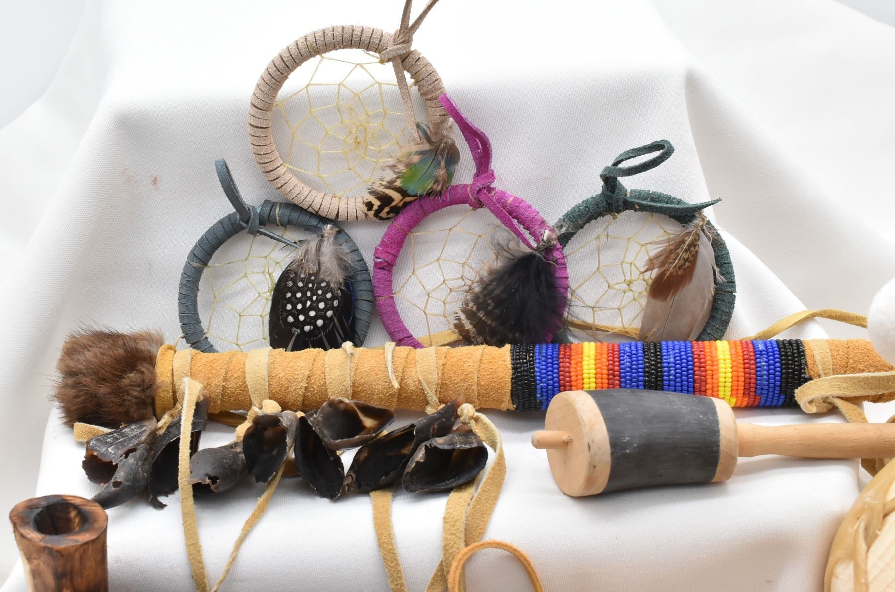 Native American Collectibles, includes 1. Cochiti Hide and Wood Drum w/ Beater 2. Three Cheyenne Cedar Bowl Pipes 3. Navajo Leather Wrapped Dance Wand, embellished with fur and deer hooves, longest measuring 18''L 5. Four Picurus Pueblo Leather Wrapped Dream Catchers by Tom Gray Elk Rael 6. Two Chippewa Leather Pouches, drawstring closures 7. Six Nations Cow Horn and Wood Rattle DW 165 Shipping $18.00