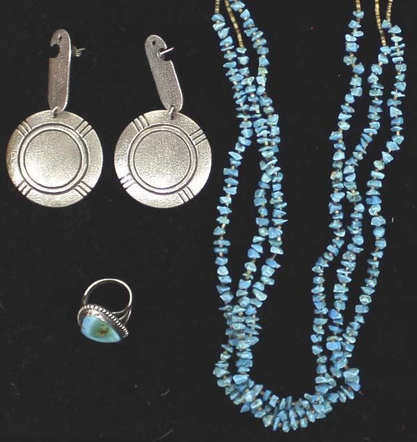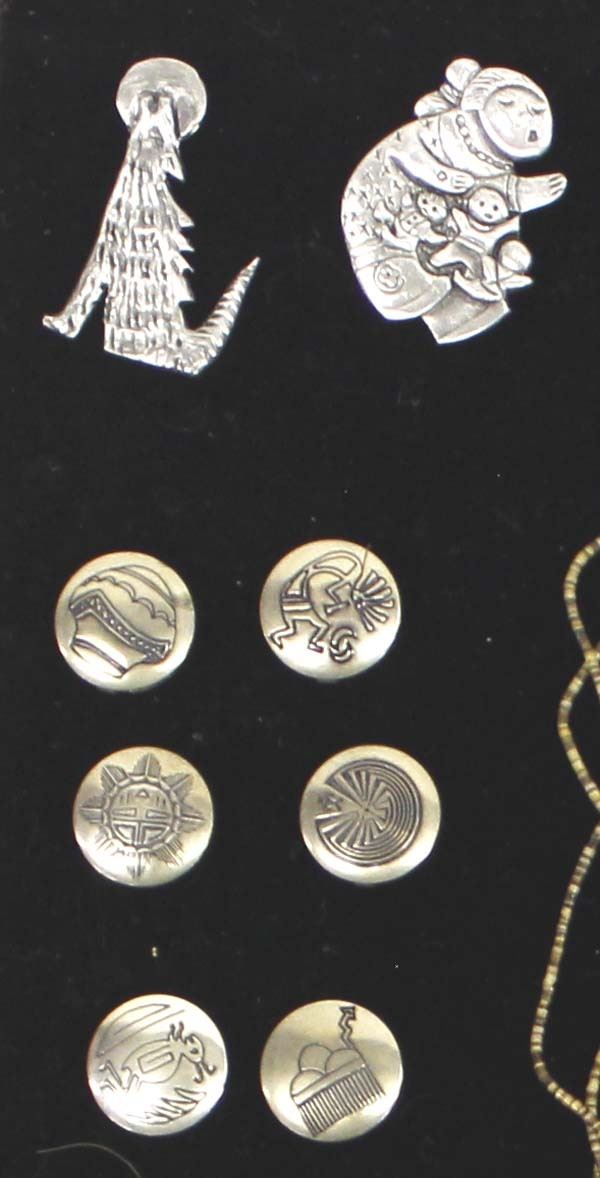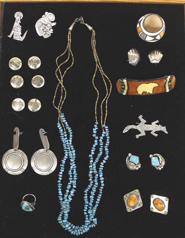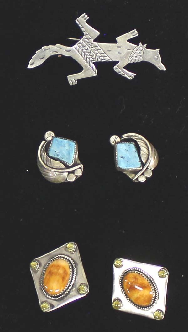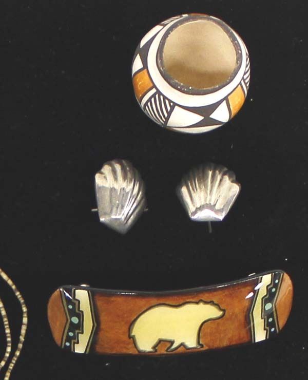 Native American Collectibles Plus, includes Navajo Earrings by Platero, Acoma Miniature Pottery Jar by Vallo, Navajo Turquoise Nugget and Pen Shell Heishi Necklace - longest measuring 26''L end to end - sterling cones, Navajo Sterling Turquoise Ring - Size 7, Navajo Red Shell & Peridot Clip-On Earrings, Navajo Sterling Whimsical Coyote Pin, 2 Pewter Pins, Taxco Sterling Earrings, Hand Painted Moose Antler Hair Barrette by Pete & Vicki Gould, Button Covers, and Cochiti/Zuni Sterling & Carved Turquoise Clip-On Earrings by Bernadette Eustace, measure 1'' x 1'' and are hallmarked