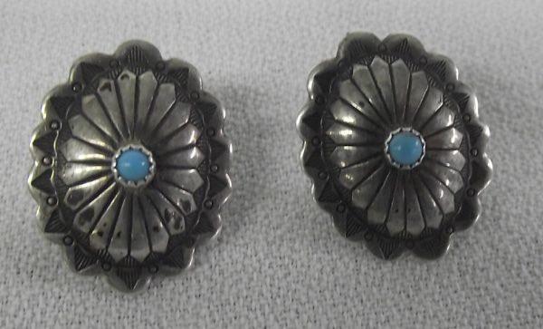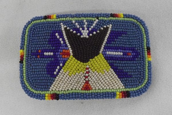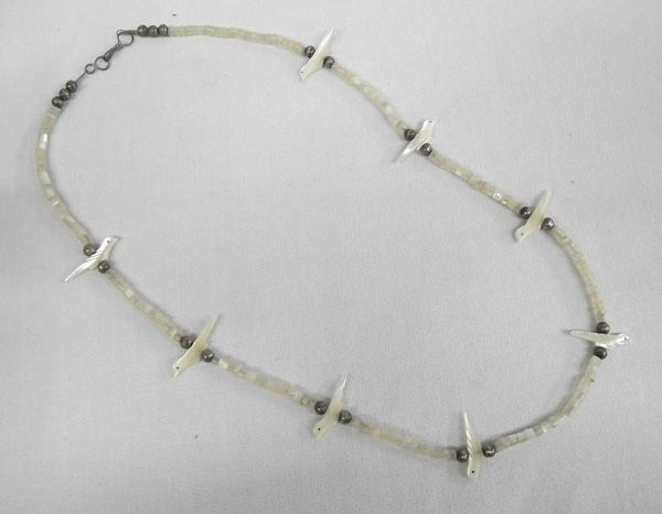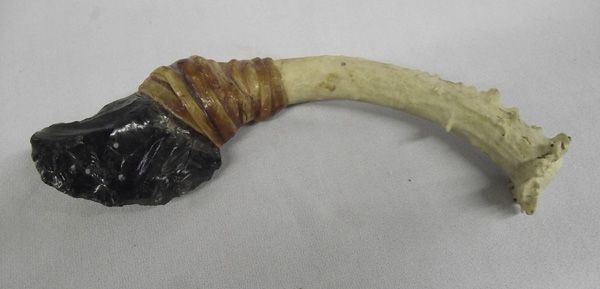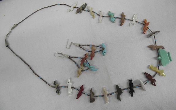 Native American Collectibles. #1 Antler Handled Obsidian Knife, #2 Plains Indian Beaded Belt Buckle (tipi and peyote bird) #3 Zuni carved fetish necklace and earrings #4 Fetish bird necklace #5 Navajo Sterling Silver Bracelet .75''W and inside measurement of 6.5'' which includes opening #6 Navajo Sterling Silver Turquoise Concho Style Earrings #7 Harepipe Bead & Concho Leather Belt 34.5'' end to end and 1.25''W, marked Tony Lama
