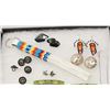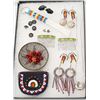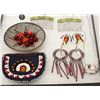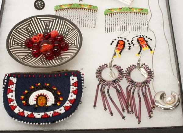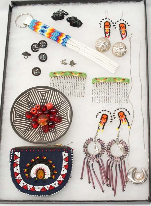 Native American Collectibles, largest is Acoma Pottery Shallow Bowl measuring 3''D, includes Earrings, Necklace, Beads, Hair Combs, Beaded Coin Purse, Buttons, and Keyring