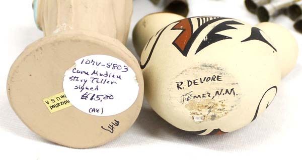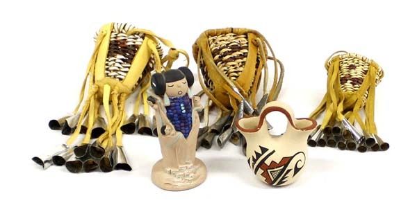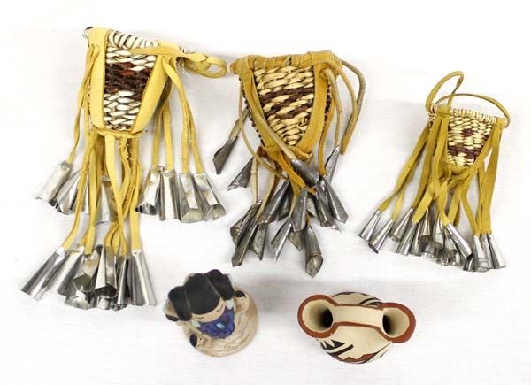 Native American Collectibles, longest measures 4'', includes 3 Apache Burden Baskets with tin jingles, small Jemez Pottery Wedding Vase by R. Devore, and Corn Maiden Storyteller