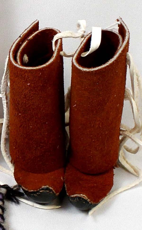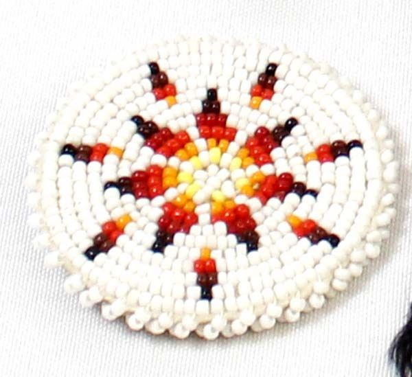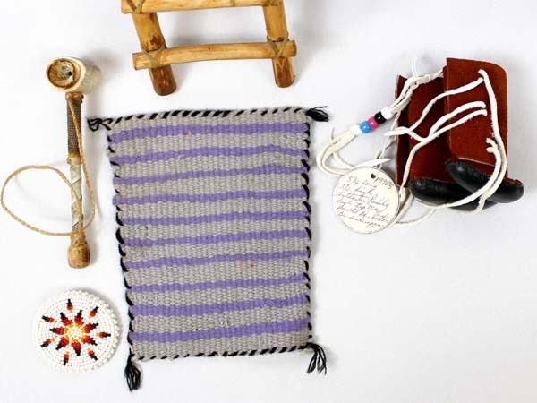 Native American Collectibles, includes 1. Antler Pipe 2. Navajo Wool Textile Sampler 3. Sioux Beaded Medallion 4. Miniature Leather High Top Moccasins 5. Miniature Kiva Ladder which is the largest item measuring 11.5''L x 4.25''W at the widest point