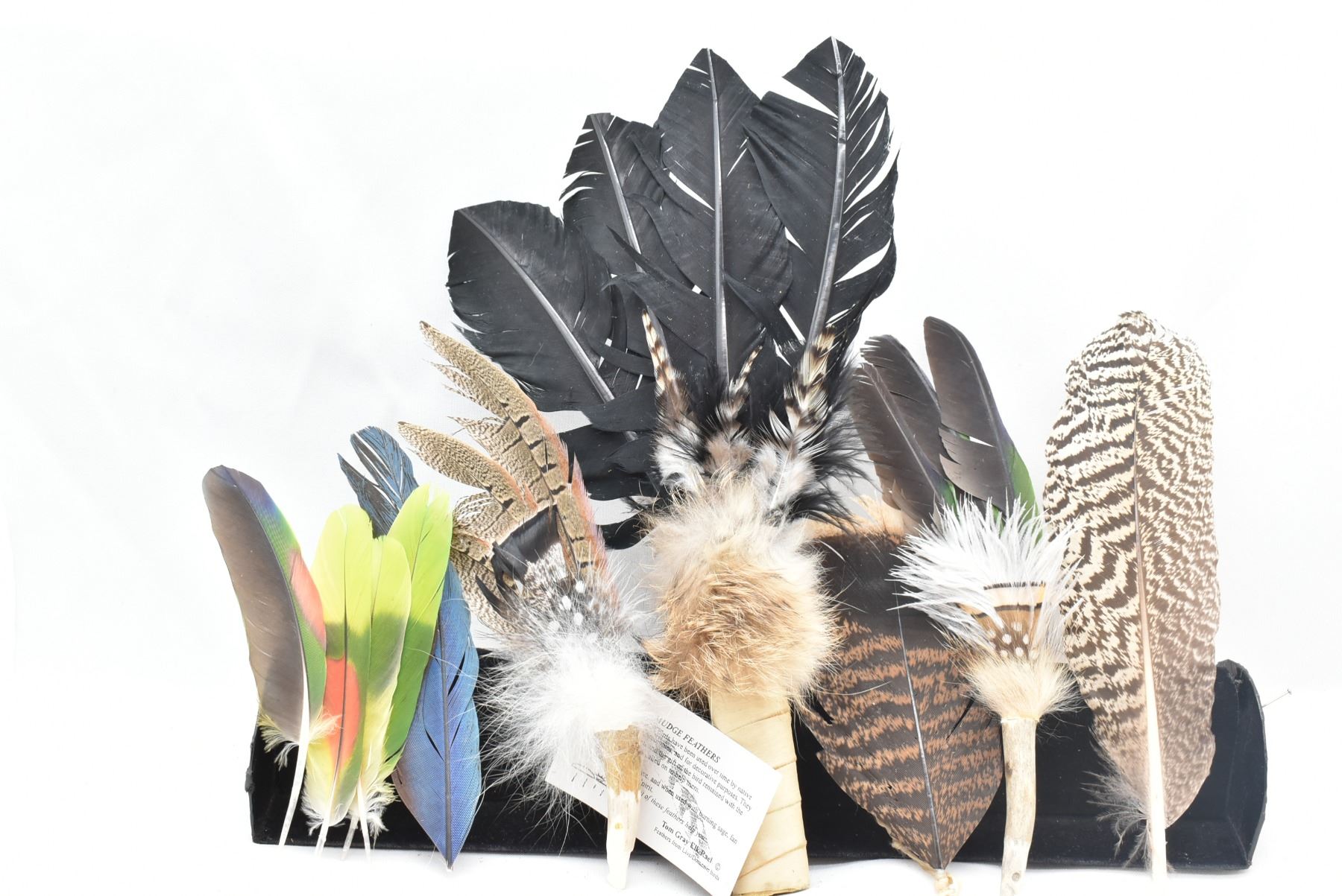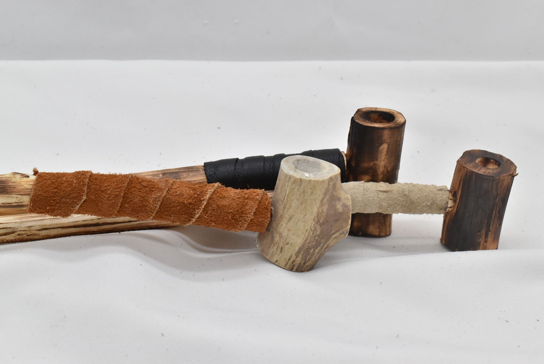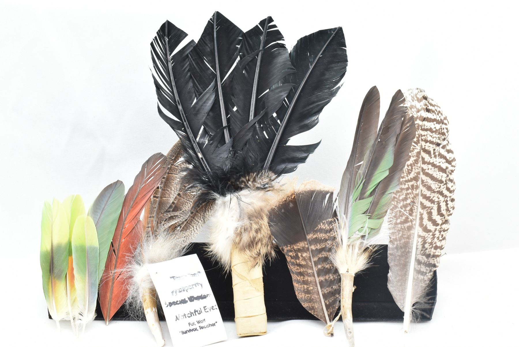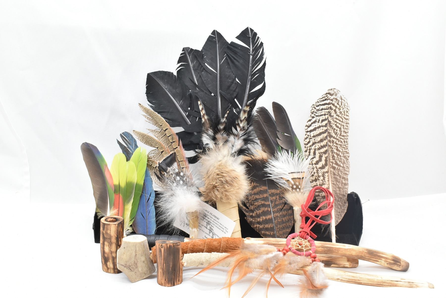 Native American Collectibles, includes 1. Three Navajo Pipes, all with wood stems, 2 have carved wood bowls and the other has a carved antler bowl, partial leather wrapped stems 2. Two Picuris Pueblo Carved Eagle Antler Head Smudge Feathers, embellished with colorful feathers and fur 3. Picuris Pueblo Bead and Leather Dream Catcher Necklace, embellished with feathers 4. Picuris Pueblo Feather Fan, embellished with coyote and rabbit fur, leather wrapped handle 5. Seven Single Feathers, longest is the antler pipe measuring 14 3/8''L, nice bright colors