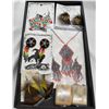 Native American Collectibles, includes beaded earrings, pottery ornaments, jewelry, vamps, Huichol beaded chile pepper, keyrings, felt mittens, wood burned knife sheath (largest measuring 7.5'' x 2.5''