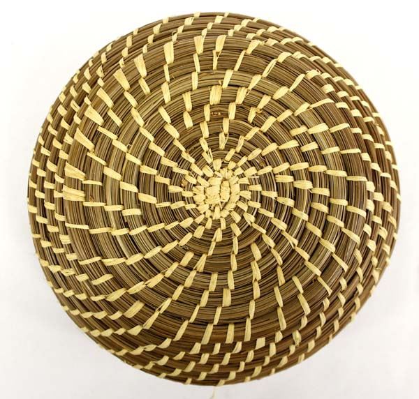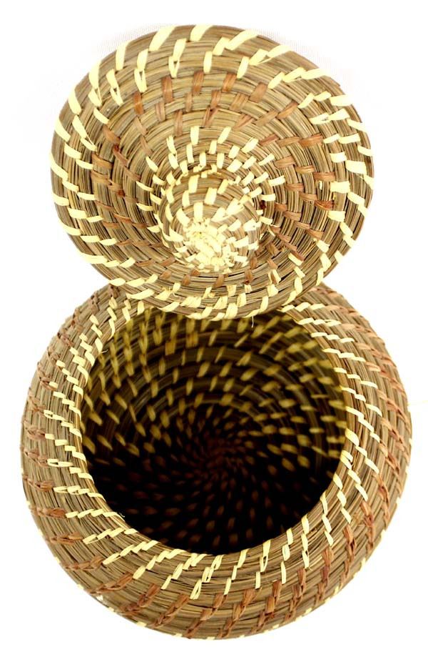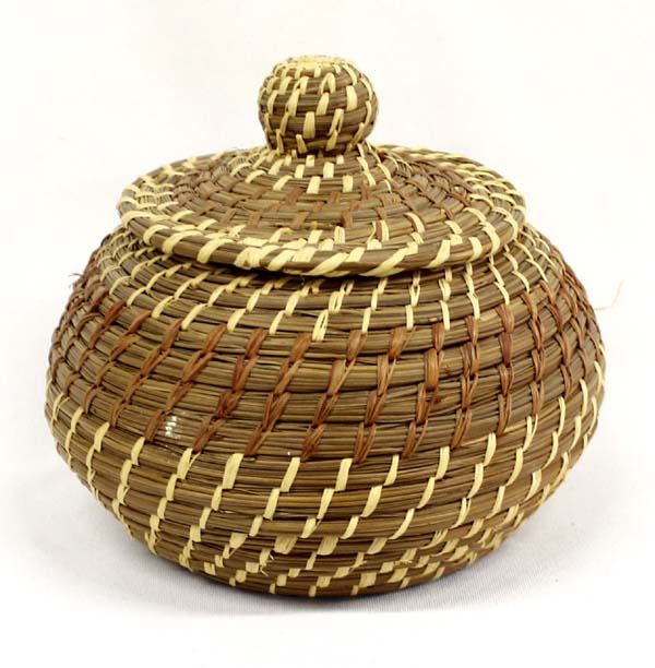 Native American Coushatta Lidded Pine Needle Basket, measures 7'' x 5.5''