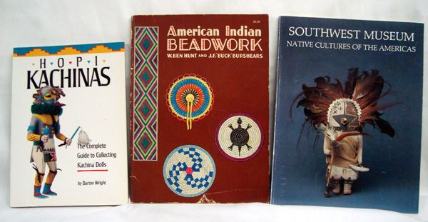 Native American Crafts Reference Softback Books, largest measures approx. 11 x 8.5''. Hopi Kachinas by Barton Wright, Southwest Museum Native Cultures of the Americas 1987 Southwest Museum, American Indian Beadwork - W. Ben Hunt and J. F. Buck Burshears. - Southwest Museum Native Cultures of the Americas - Masterkey, Vol, No 2 & 3, Summer / Fall, 1987, Overview, NW Coast, SW, CA, Plains Indians and the Casa de Adobe. Lovely photos. Paper.