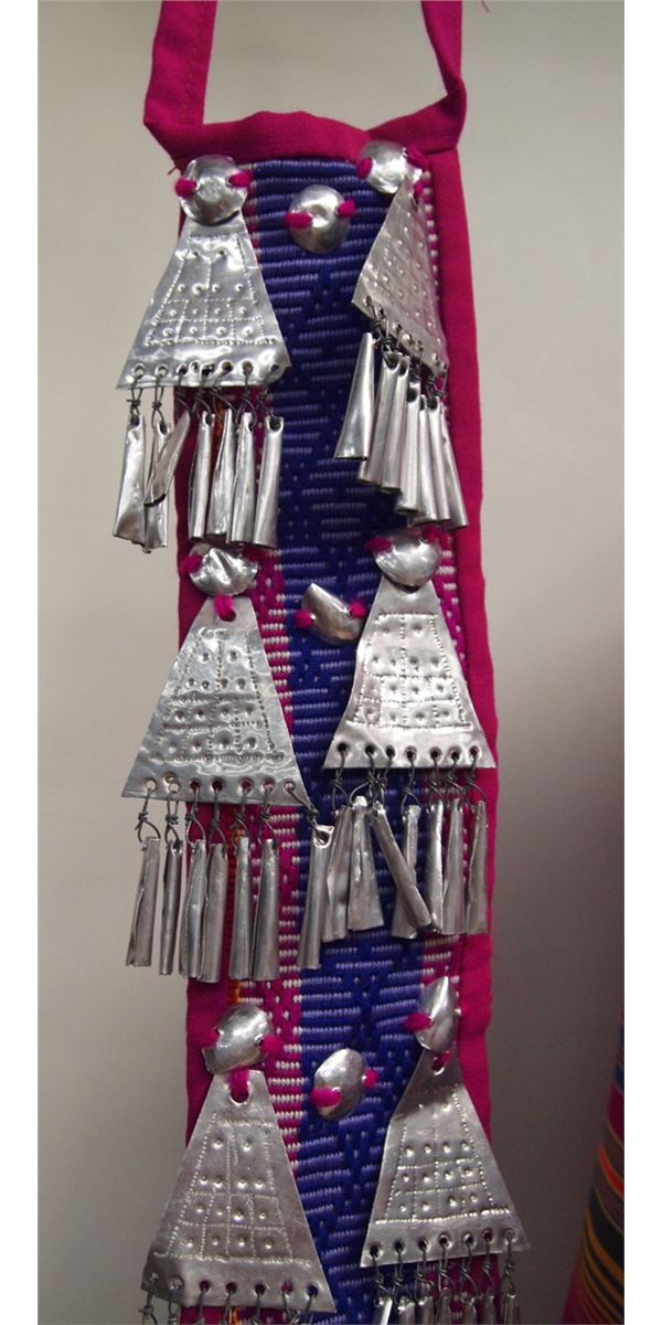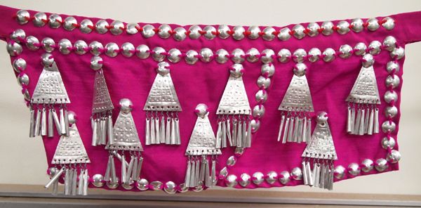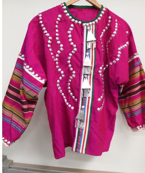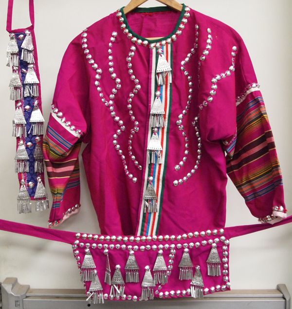 Native American Dance Costume. Bright magenta with accent colors of purple, green, red and white. Covered with aluminum coins, stitched around all the pieces with stamped aluminum coins which provides the ''music''. Measures a small-medium with raglan sleeves, snap front. Shoulder to hem measurement 23'', bust approximately 40''. Apron measures 6 1/2'' x 6'' wide. Waist tie for front or back 17'' high x 2 1/2'', ties 38''.