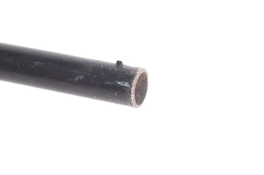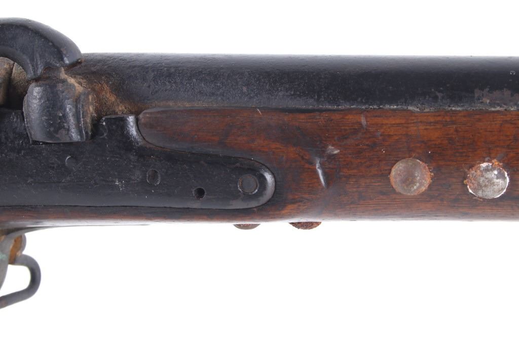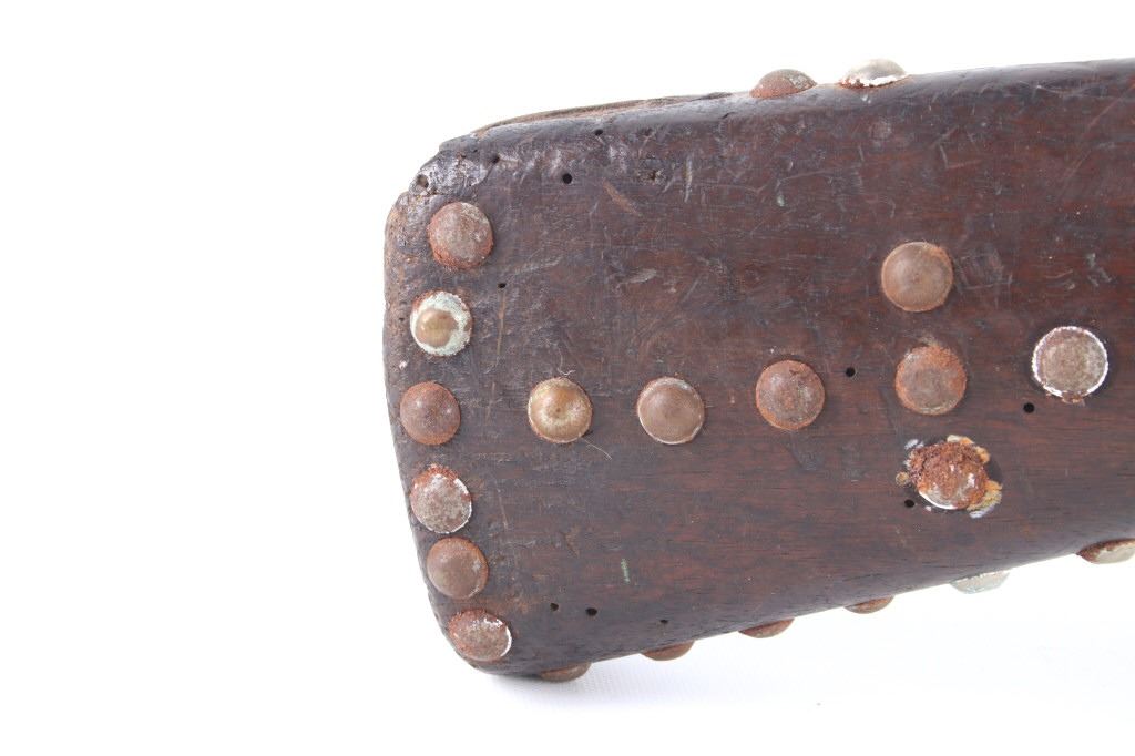 which now measures approximately 31” from butt to forend tip also shows great age and wear. It is profusely decorated with numerous brass tack designs. Many of the tacks show heavy wear, denting and oxidation. The barrel band that secures the stock is cut in a primitive decorative pattern and is held by iron nails. The barrel, lock and trigger guard have a dark metal preservative added to prevent further rust and corrosion. The lock functions with the hammer notches weak. The barrel still retains British proof marks at the breech end. The barrel measures approximately 28” from the muzzle to the breech and was probably shortened to this length before being traded to the Native Americans because it is cut square and has a bead front sight. Barrels shortened in the field are usually unevenly cut and almost never have a front sight. Interestingly, there is a crudely copper lined hole in the forward portion of the