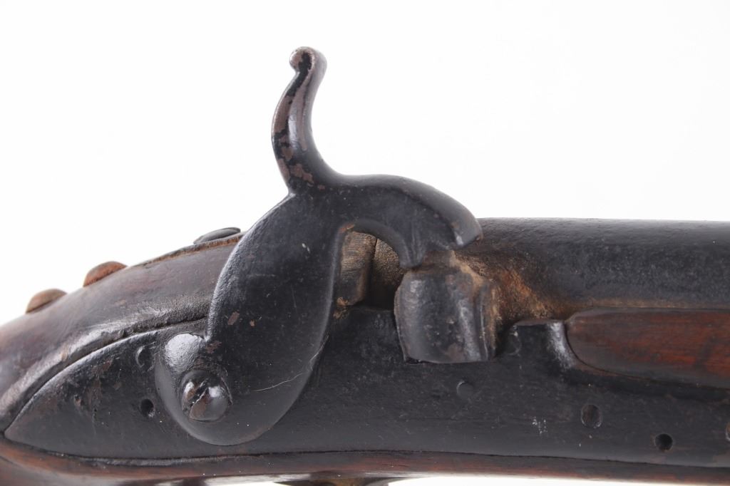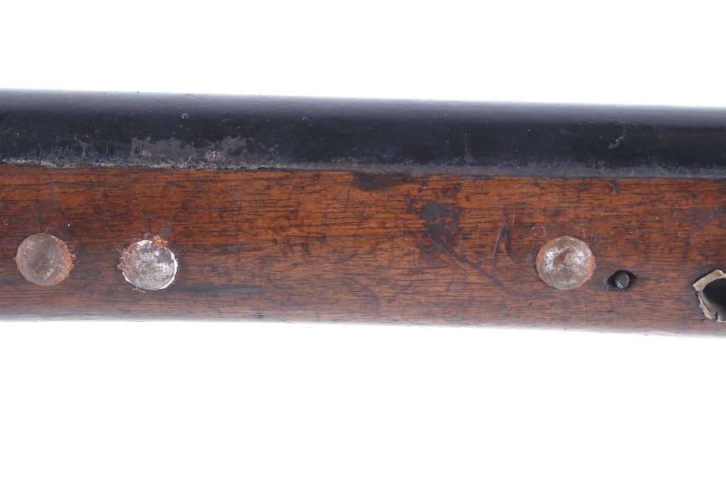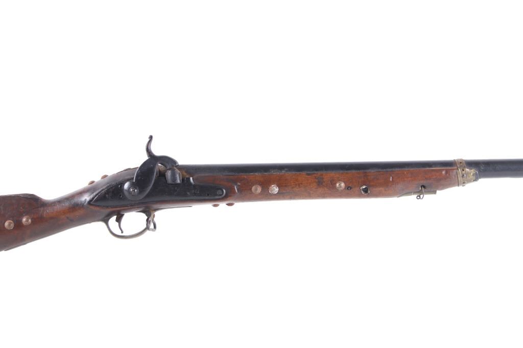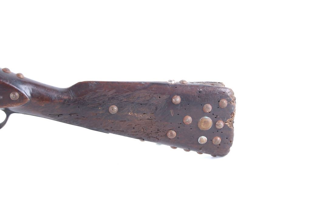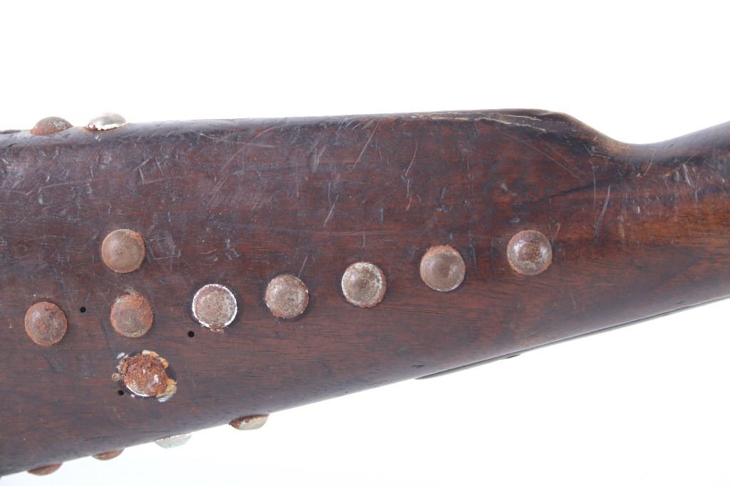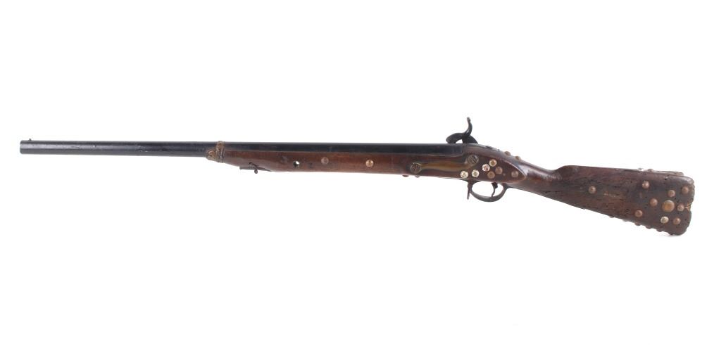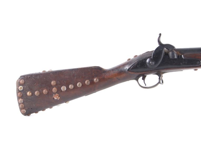 Native American decorated musket. Typical of Mid-19th century arms used by Native Americans, this is a typical of numerous British origin trade muskets that were sent West and actively bartered for pelts and hides. Originally flintlock and later altered to percussion ignition, the large approximately .80 caliber smooth bore barrel could be loaded with a heavy round ball for close range big game hunting, or loaded with shot for wild fowl and small game. The stock and barrel were shortened for easier handling on horseback and in brush. As is typical, the steel butt plate was removed probably to be used as a hide scraper, and the remaining wood that was underneath shows great age and wear. The stock