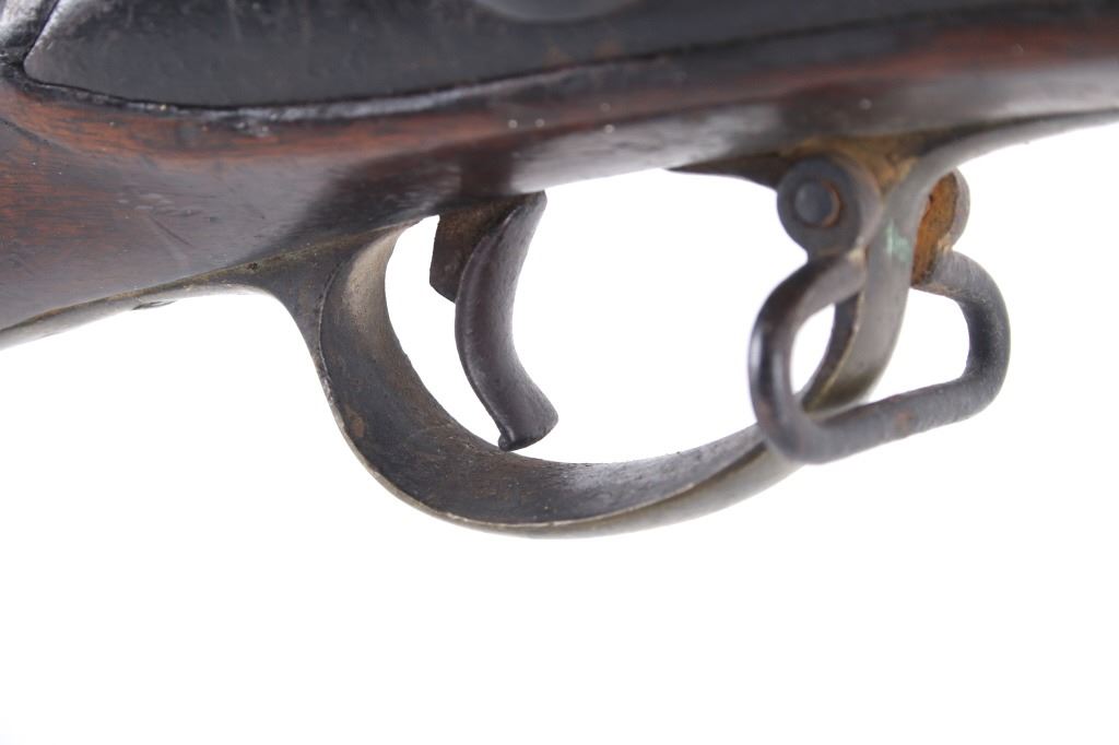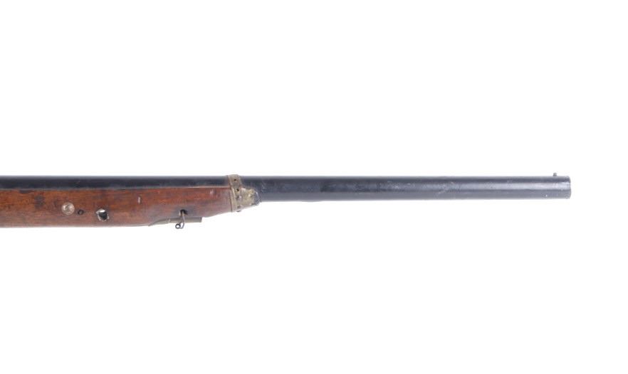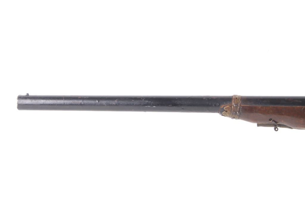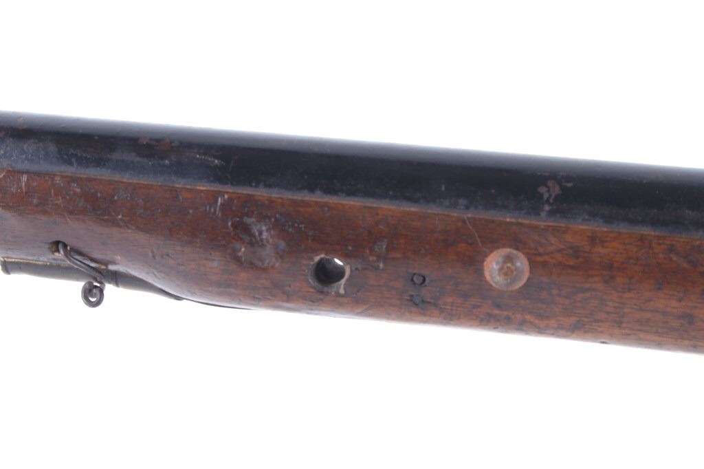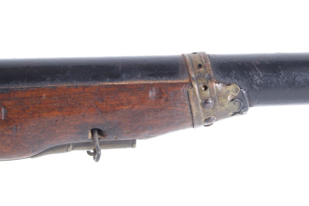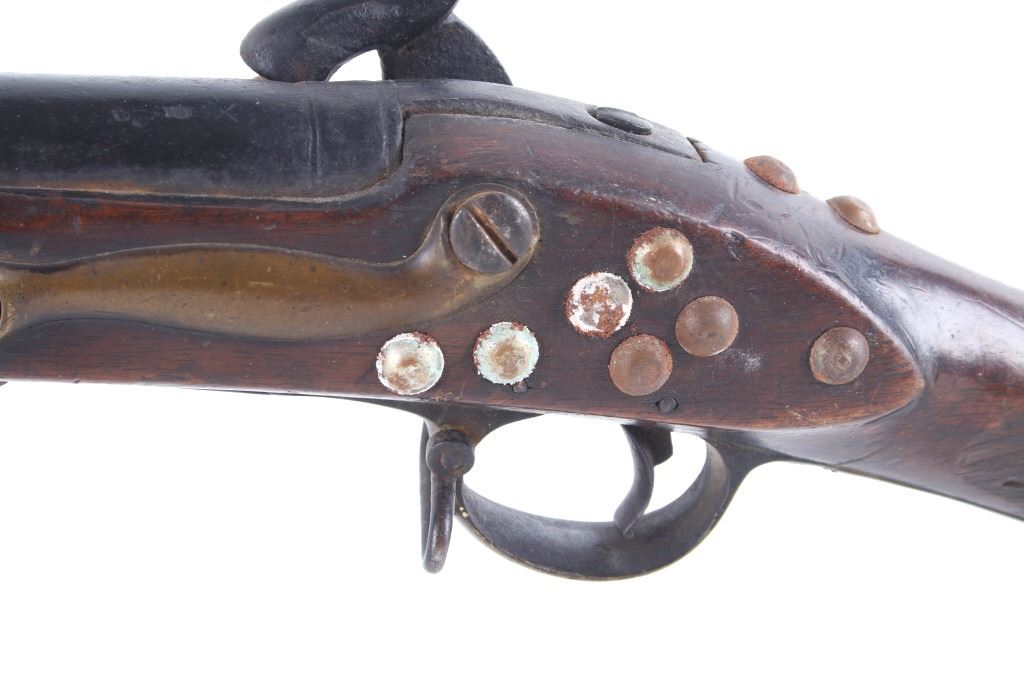 Native American decorated musket. Typical of Mid-19th century arms used by Native Americans, this is a typical of numerous British origin trade muskets that were sent West and actively bartered for pelts and hides. Originally flintlock and later altered to percussion ignition, the large approximately .80 caliber smooth bore barrel could be loaded with a heavy round ball for close range big game hunting, or loaded with shot for wild fowl and small game. The stock and barrel were shortened for easier handling on horseback and in brush. As is typical, the steel butt plate was removed probably to be used as a hide scraper, and the remaining wood that was underneath shows great age and wear. The stock
