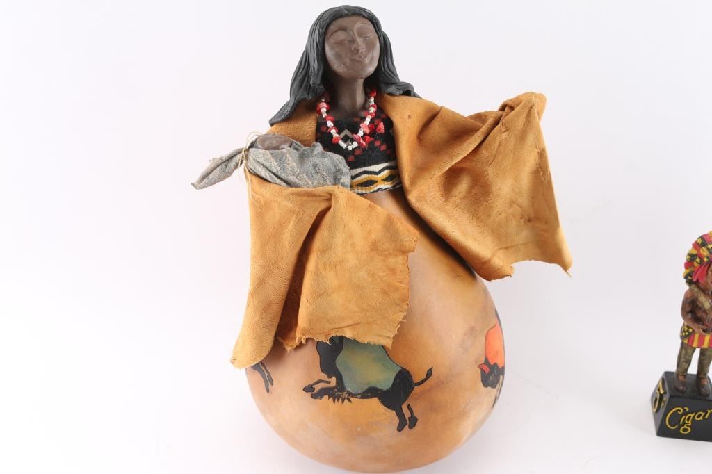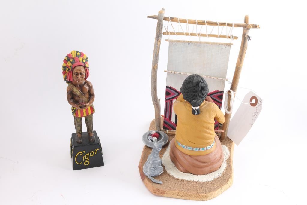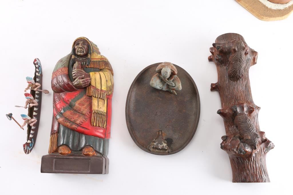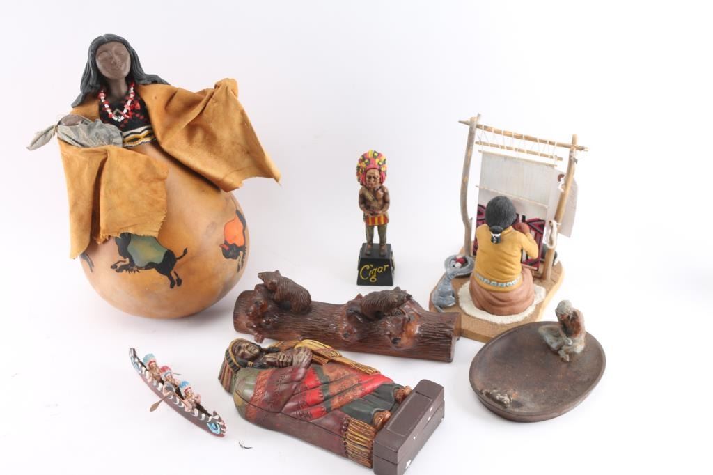 Includes a large gored Indian maiden with baby; wooden carved statue of tree and bears; wooden carved statue of Indian woman weaving rug, maker marked Tom W. Yazzie; cigar Indian bobble head; resin Indian chief cigar holder; cast iron wall hanging of Indian and buffalo skull; wooden canoe with three Indians paddling.