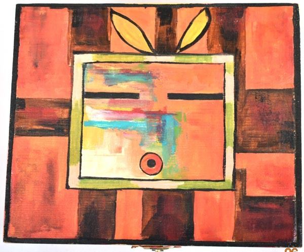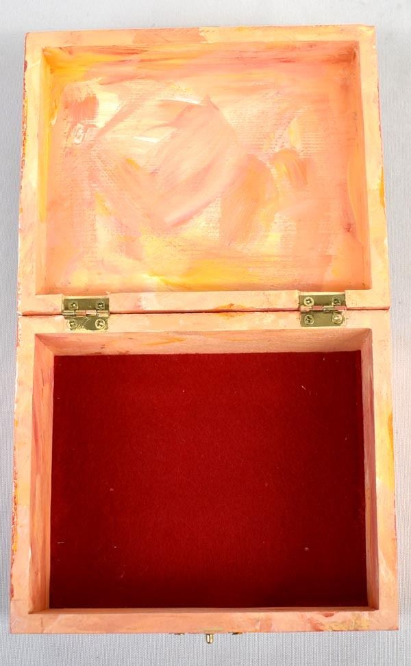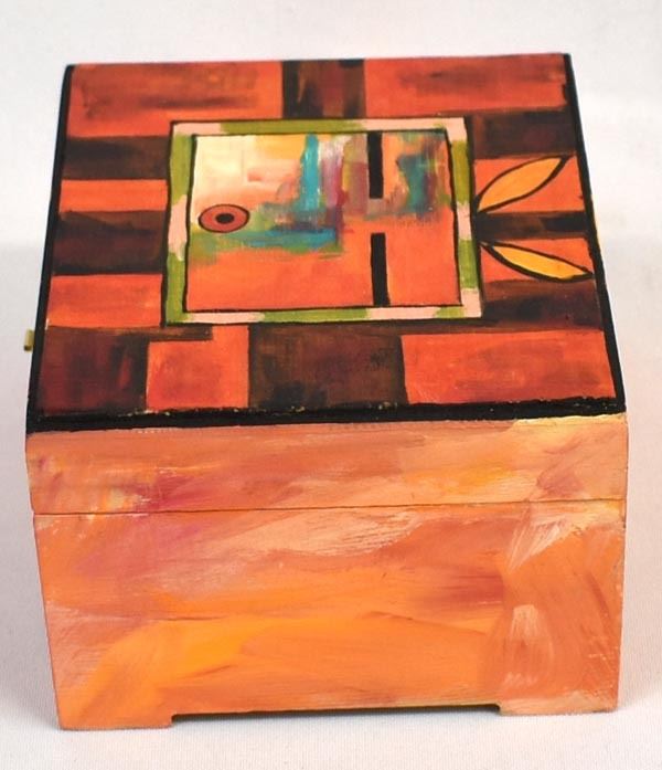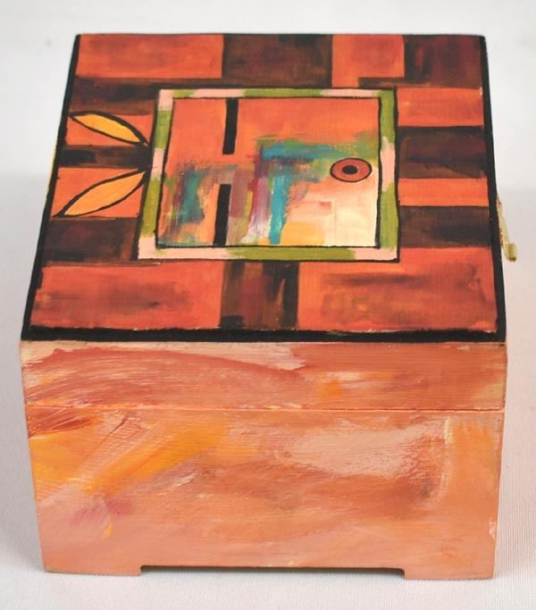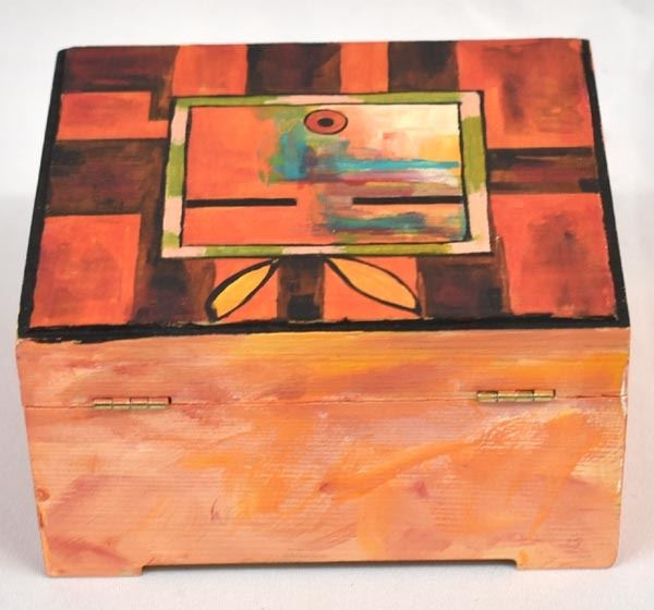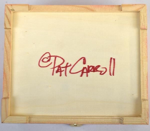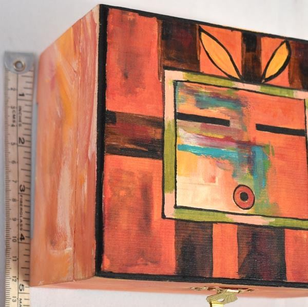 Native American Designed Wood Trinket Box by Pat Carroll, measures 5'' x 6'' x 3'', beautiful colors and signed on the bottom, Patrick Carroll (1949-2019)