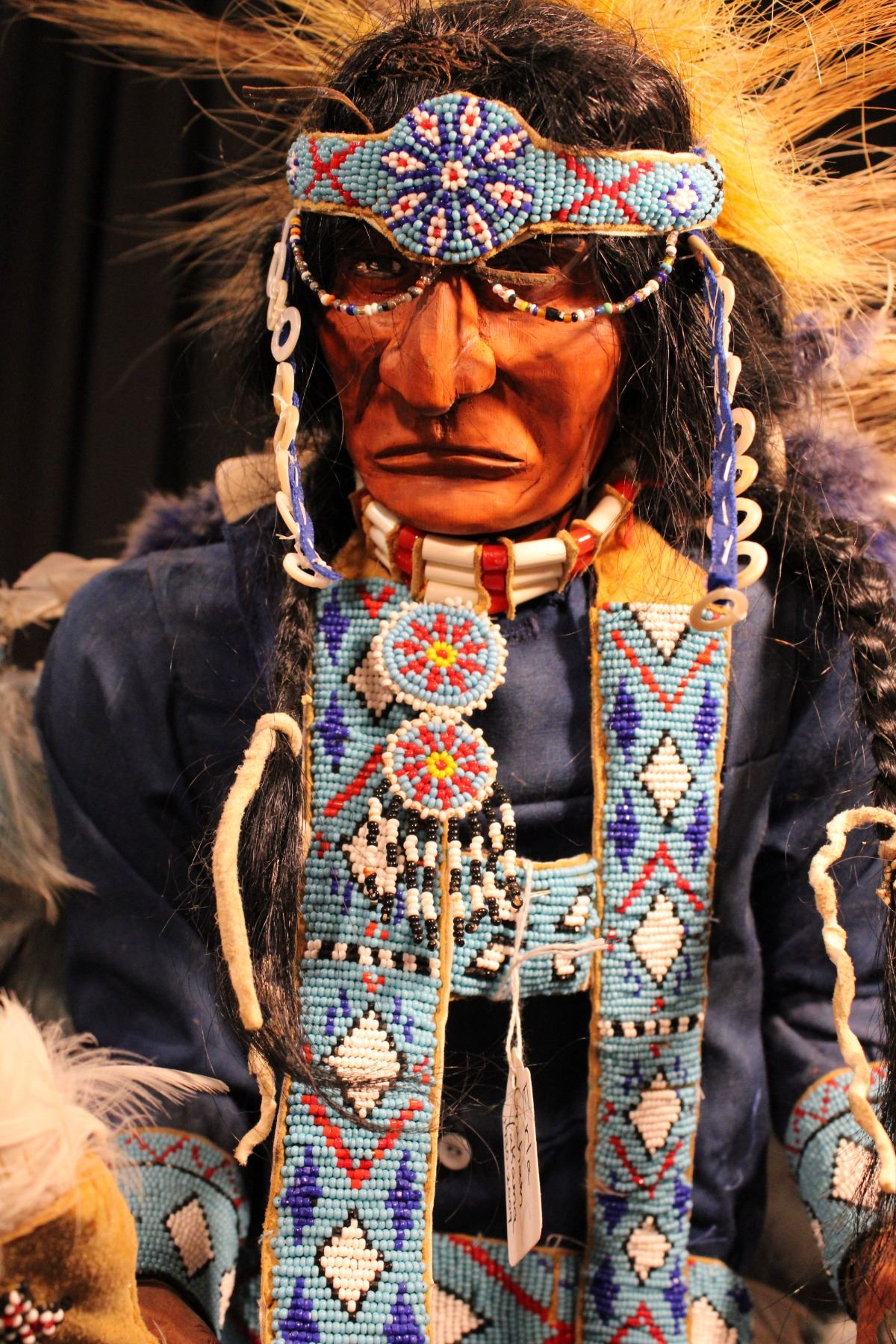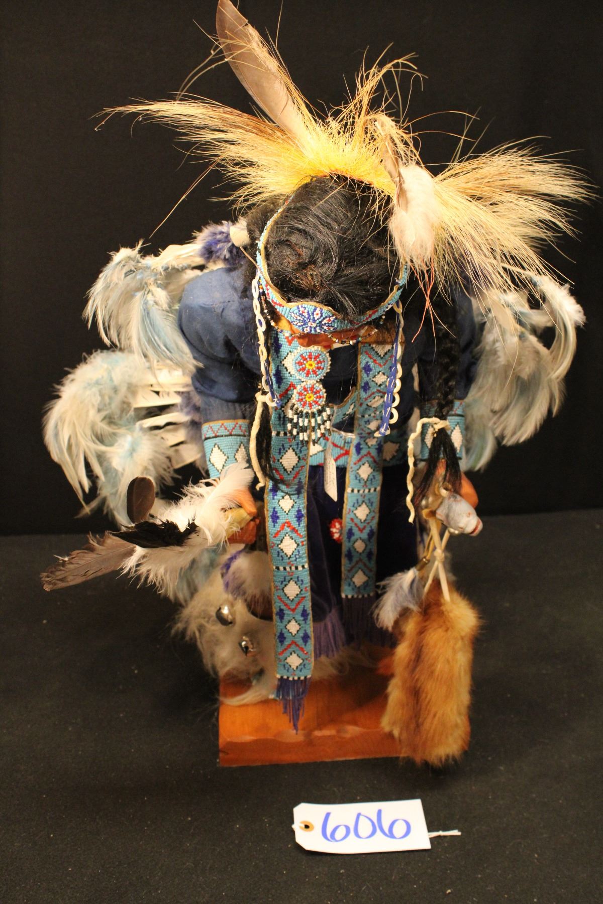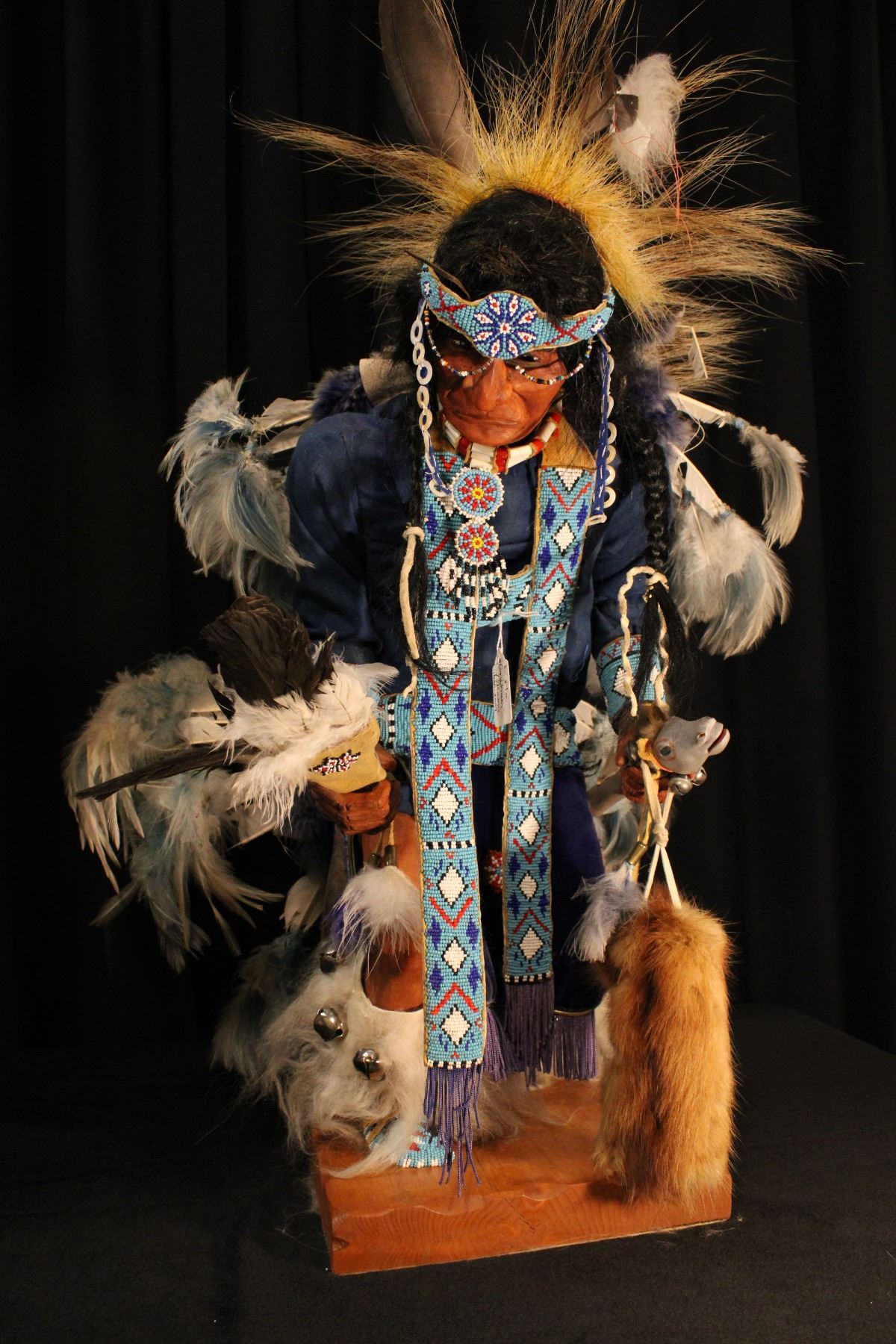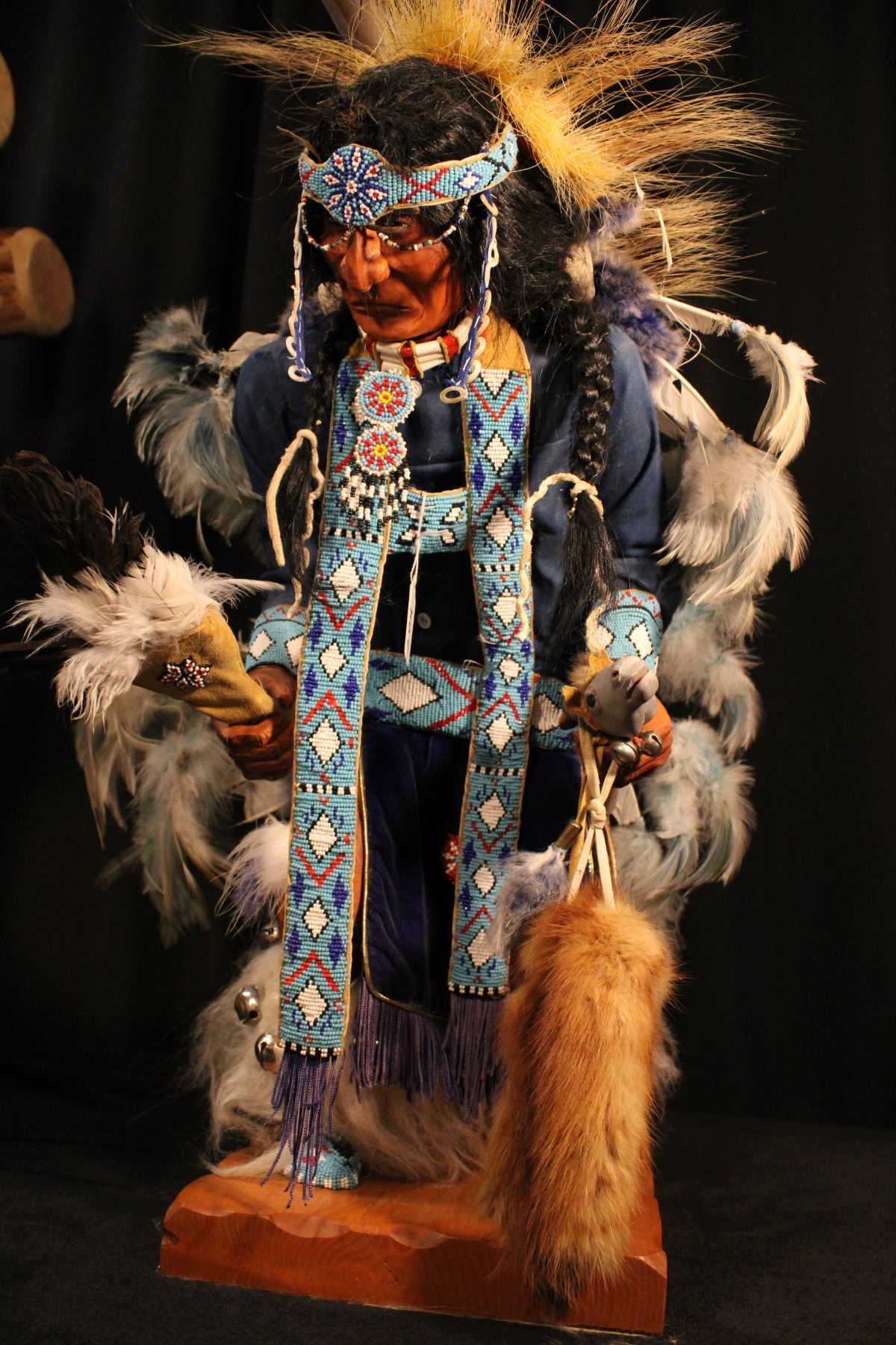 Large figure of Native American dancer. Blue cloth shirt. Made by Erla Graham 1930-2009. 24" x 7" x 9"