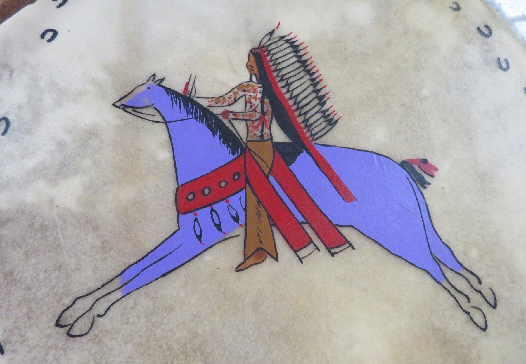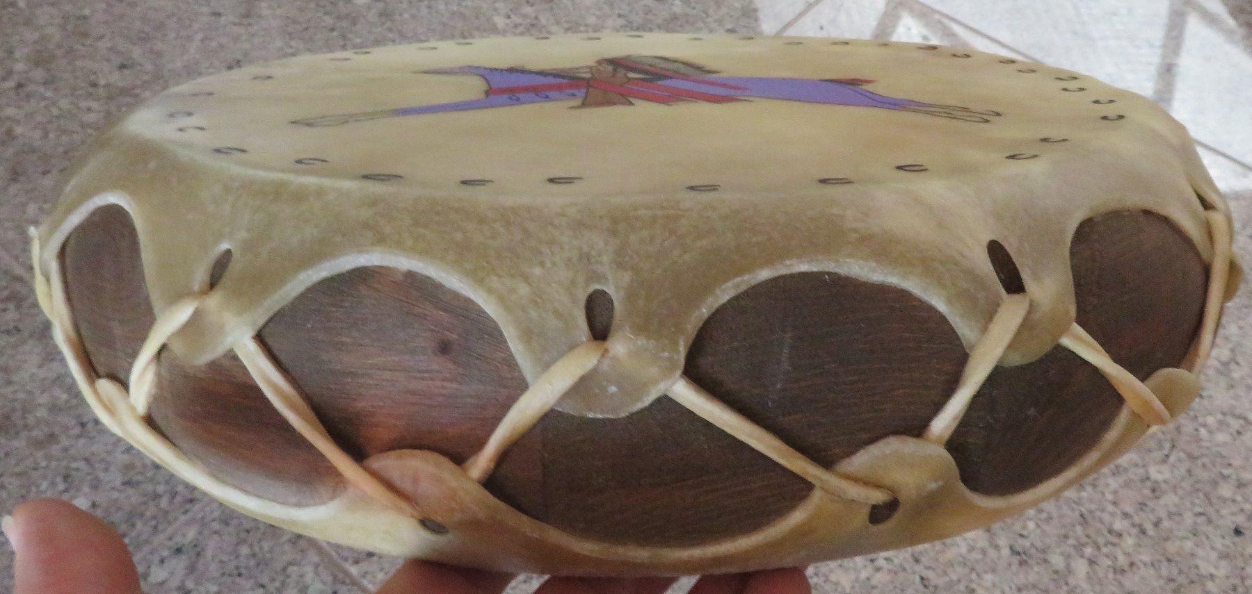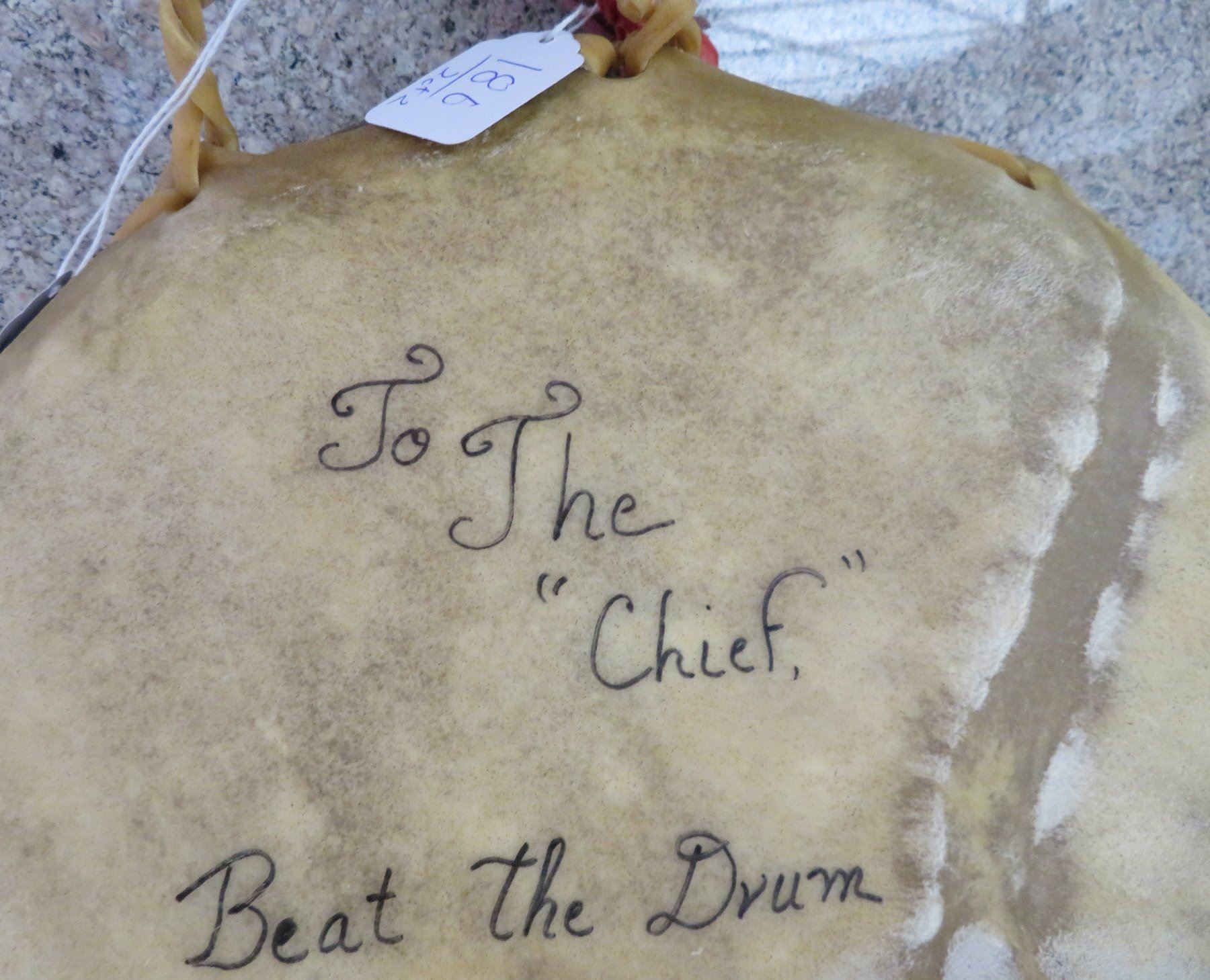 Native American Drum w/Beater, 20th century item. Made of wood and rawhide, cloth and paint, the item measures 14" x 15" x 4". Plains Indian. Has the best, deep sound. Inscription on one side, item given as gift. Fine paint. Condition: Very good, see images. Shipping: $30.00 w/insurance and signature, due to size and weight.