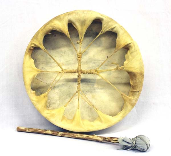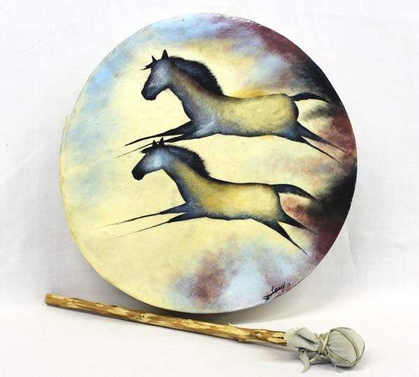 Native American Drum. Hand painted face of two horses. the drum is stretched rawhide, gathered in the back with rawhide strings and twisted into a hand hold. Has beater. Drum is 15.25'' diameter. Beater is 16.5'' long. Signed on the front.
