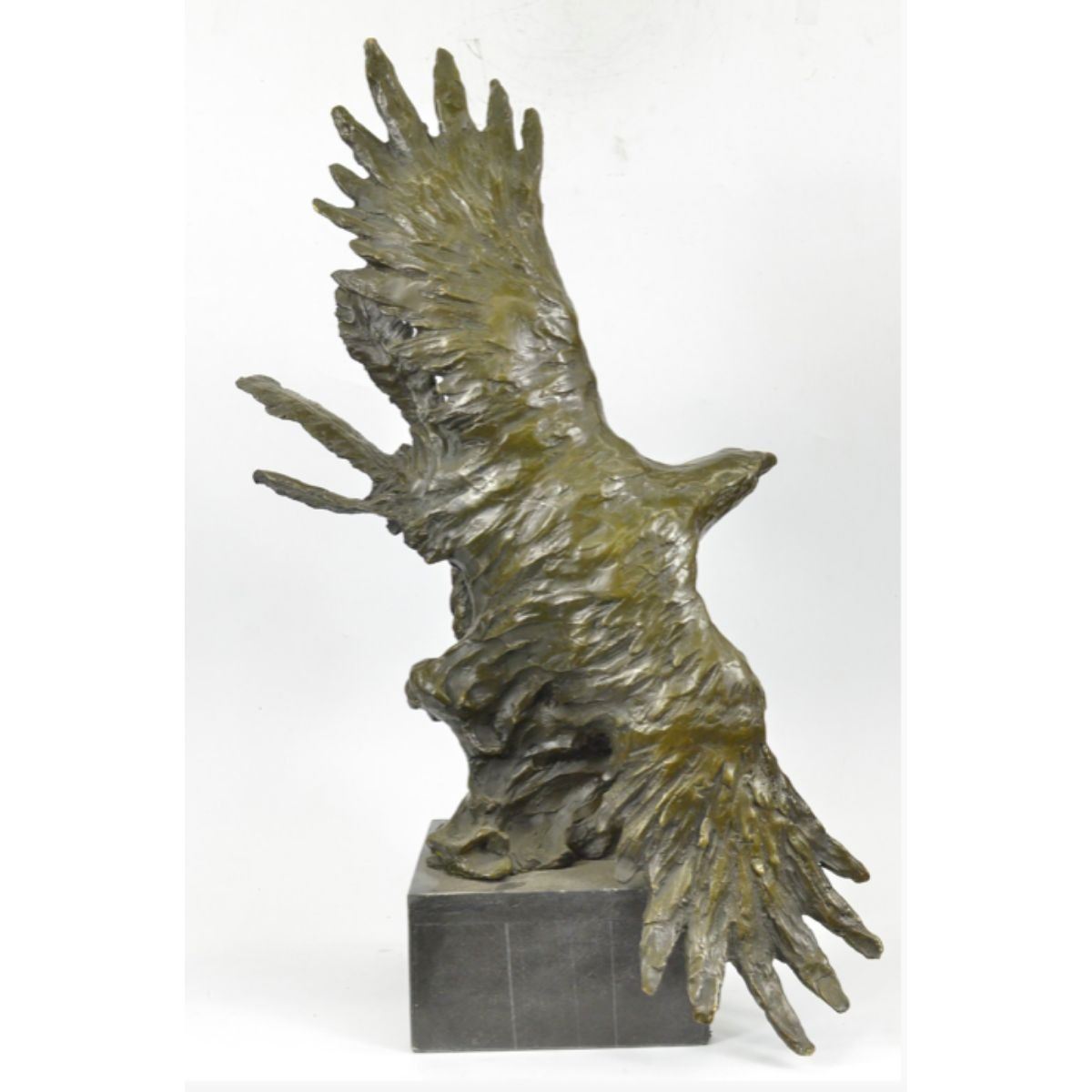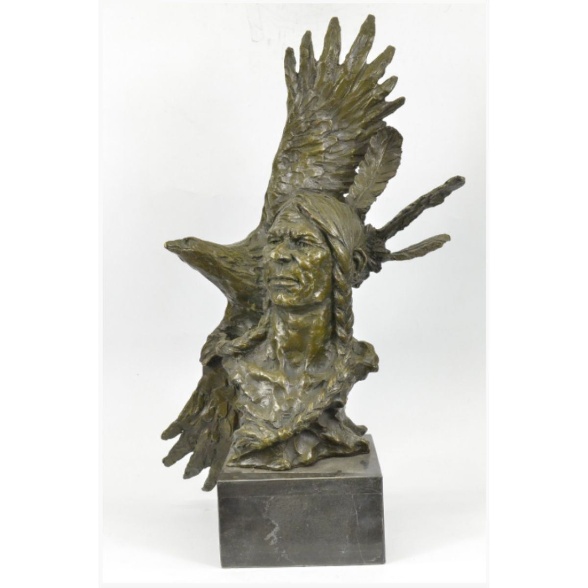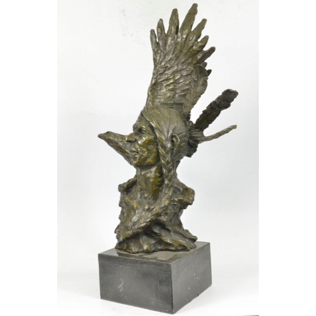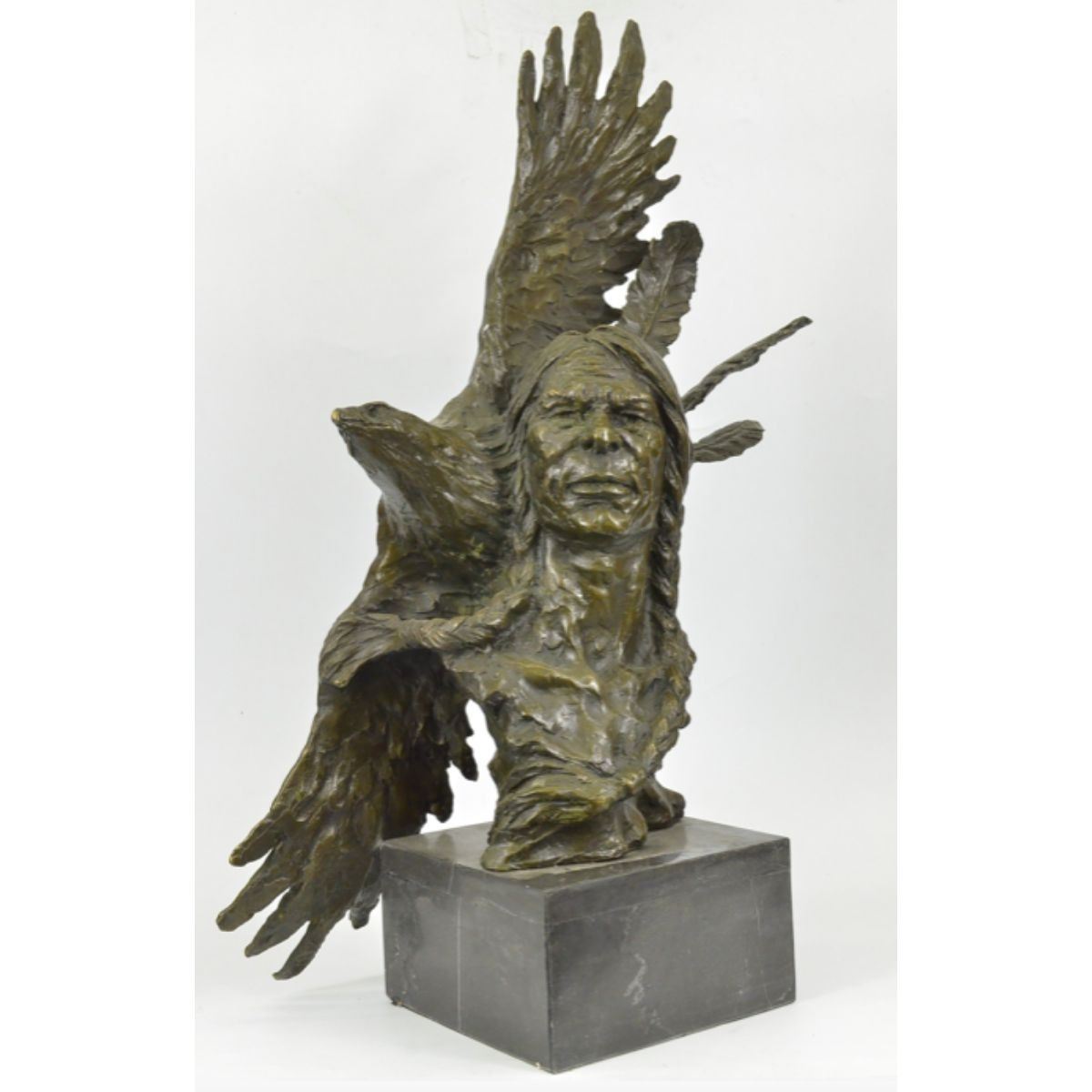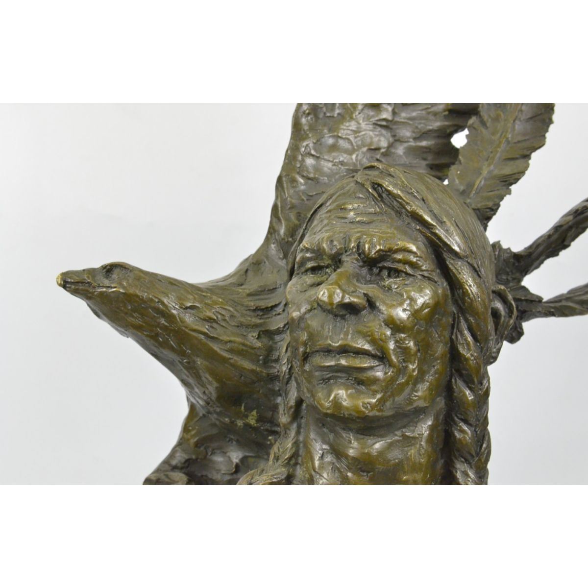 Native American Indian eagle warrior sculpture. Lost wax casting method bronze, with brown patina, mounted on a marble base. Signed by the artist, Milo, at base. 26" H X 25" W. 32lbs.Â