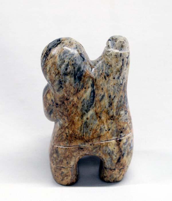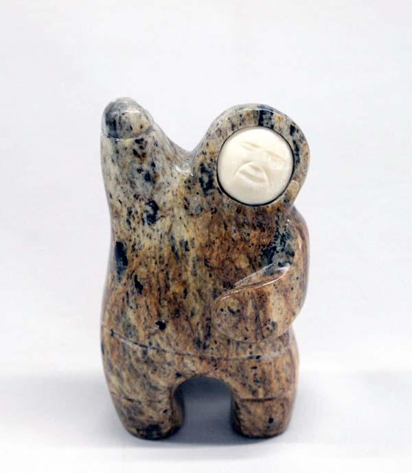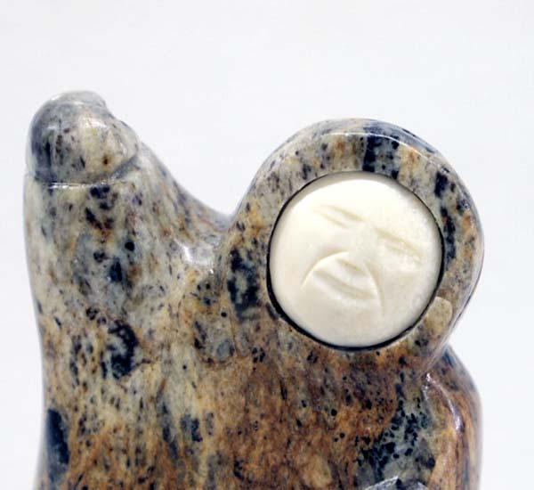 Native American Eskimo Carved Figure Signed. Carved stone with fossilized ivory face inset. Inuit dancing shaman figure is missing the object in his right hand. Signed on the bottom. Measures 3.25''Hx1.75W''x1''D. Buyers Pay Actual Shipping and Handling Charges(see terms and conditions for more information).