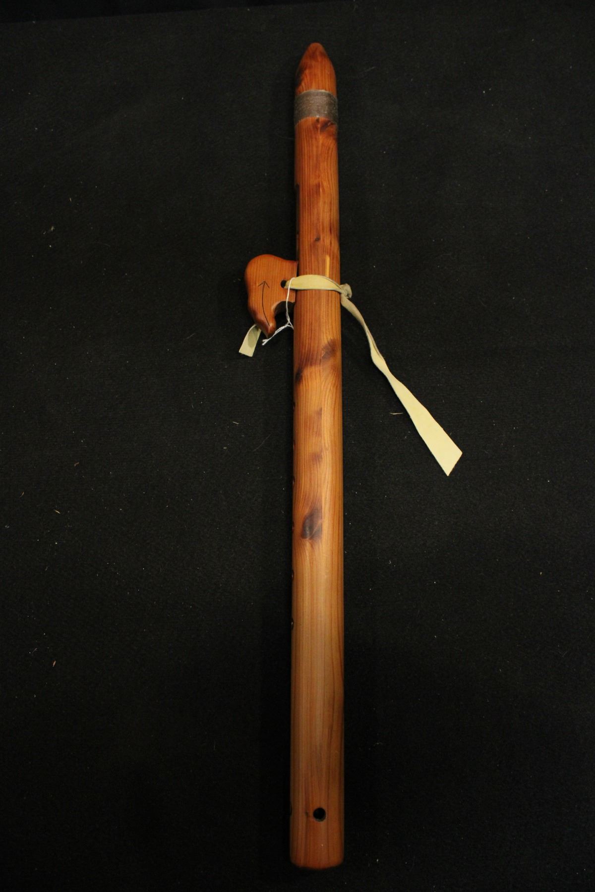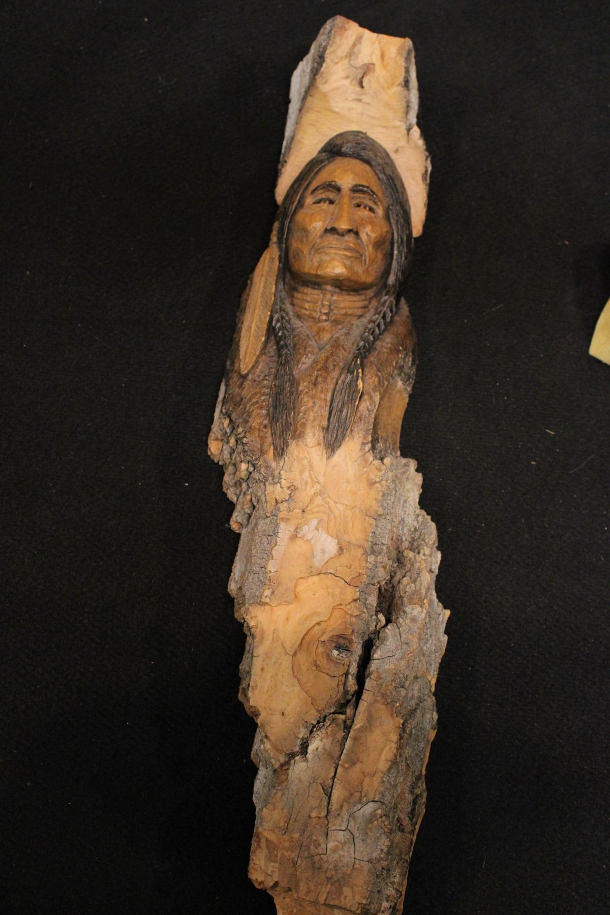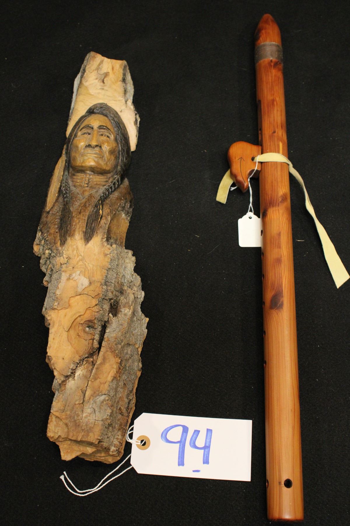 Lot w/ wooden flute w/ carved bear and carving of Native American by Grim. 25"