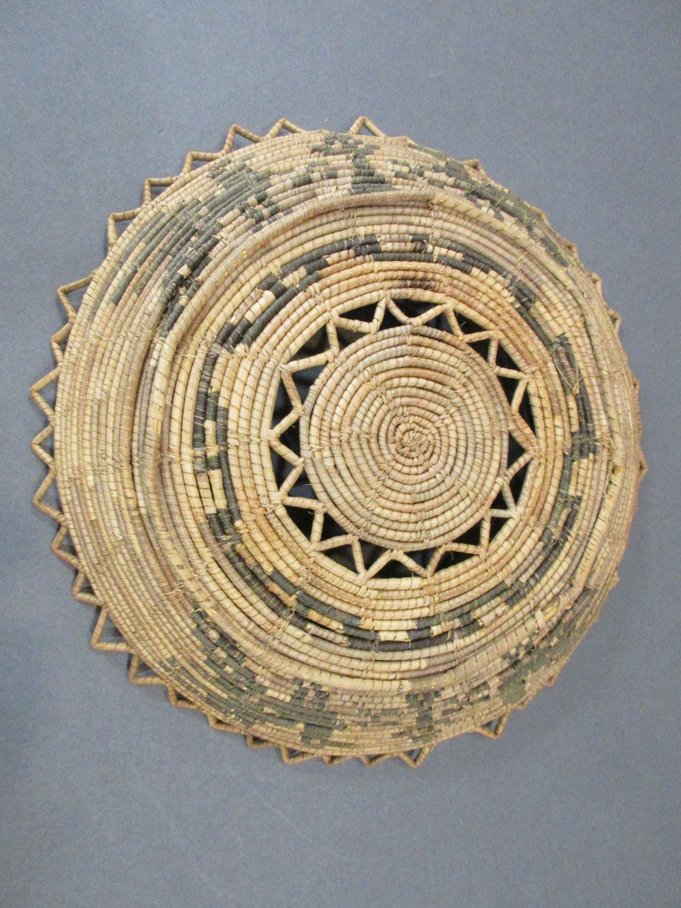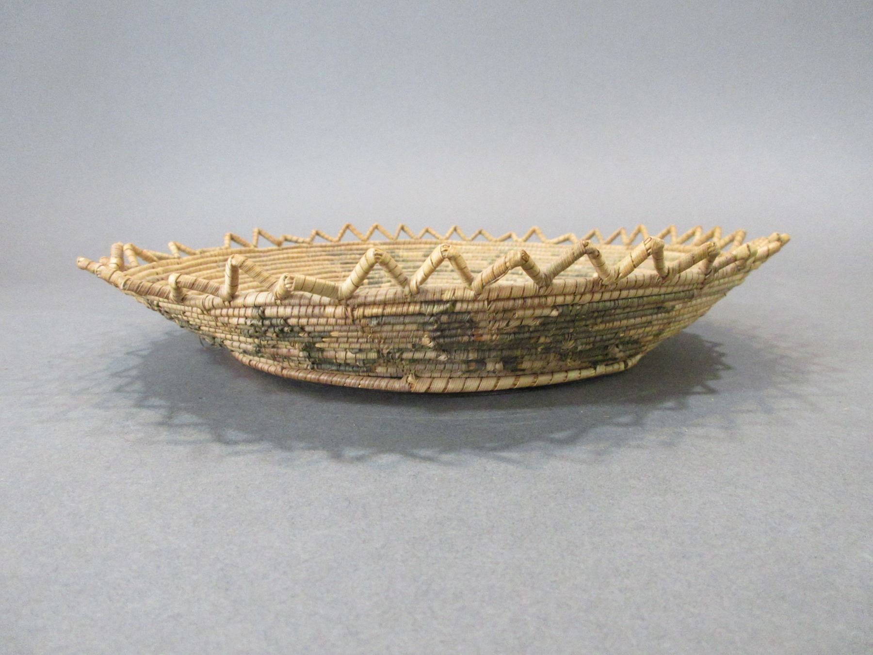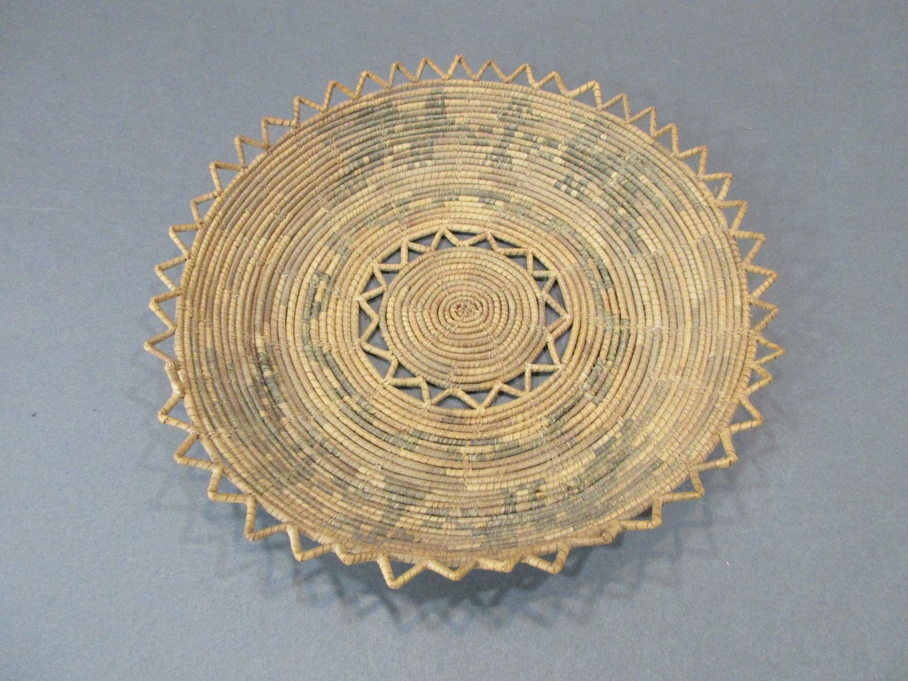 Native American Footed Shallow Basket- Scalloped Edging- Pictorial Figures- Fair Condition- 10" X 1.