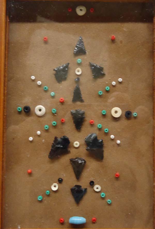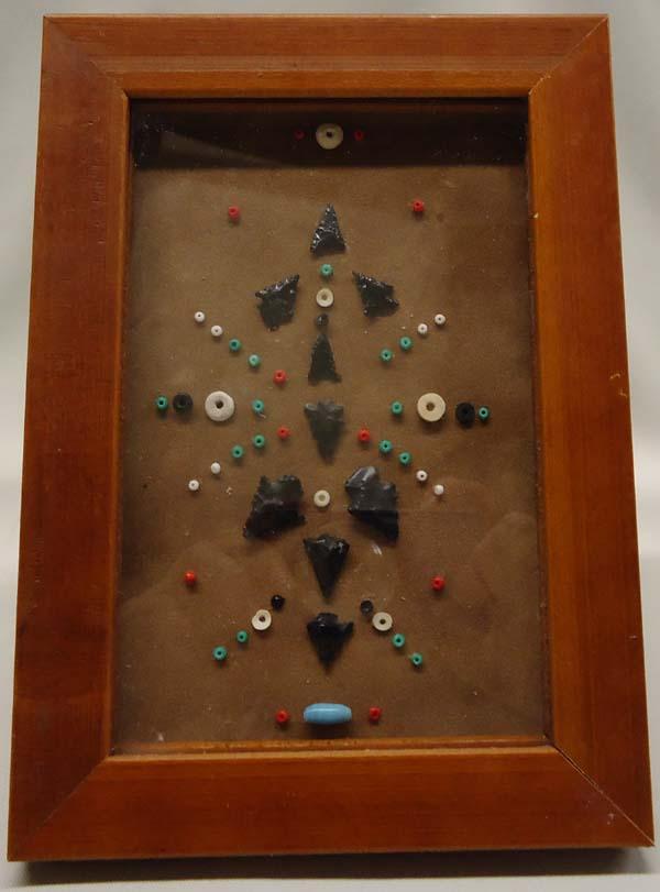 9 Framed Obsidian Arrowhead Display Points & Beads. Frame measures approx. 7 3/4'' x 5 1/2'', visual measures approx. 5 1/2'' x 3 1/2''. Framed and under glass. Buyers Pay Actual Shipping and Handling Charges(see terms and conditions for more information).