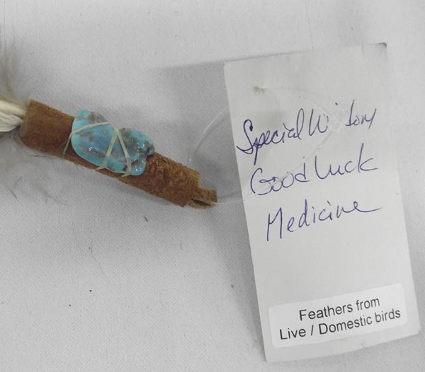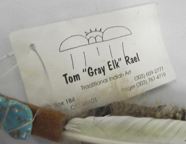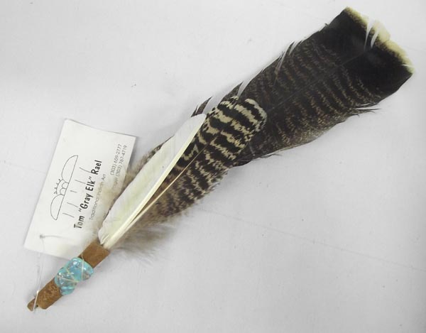 Native American Special wisdom and Good Luck Medicine Fan By Tom ''Gray Elk'' Rael. Has turquoise nugget. Measures approx. 13'' long x 3''W. Feathers from live domestic birds. Buyers Pay Actual Shipping and Handling Charges(see terms and conditions for more information).