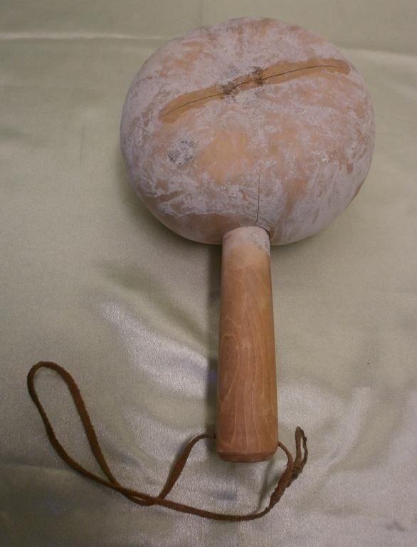 5" diameter gourd with 4" handle and leather strap. Gourd has dried and split, but has been repaired to prevent further splitting.