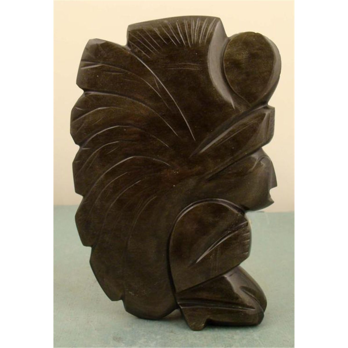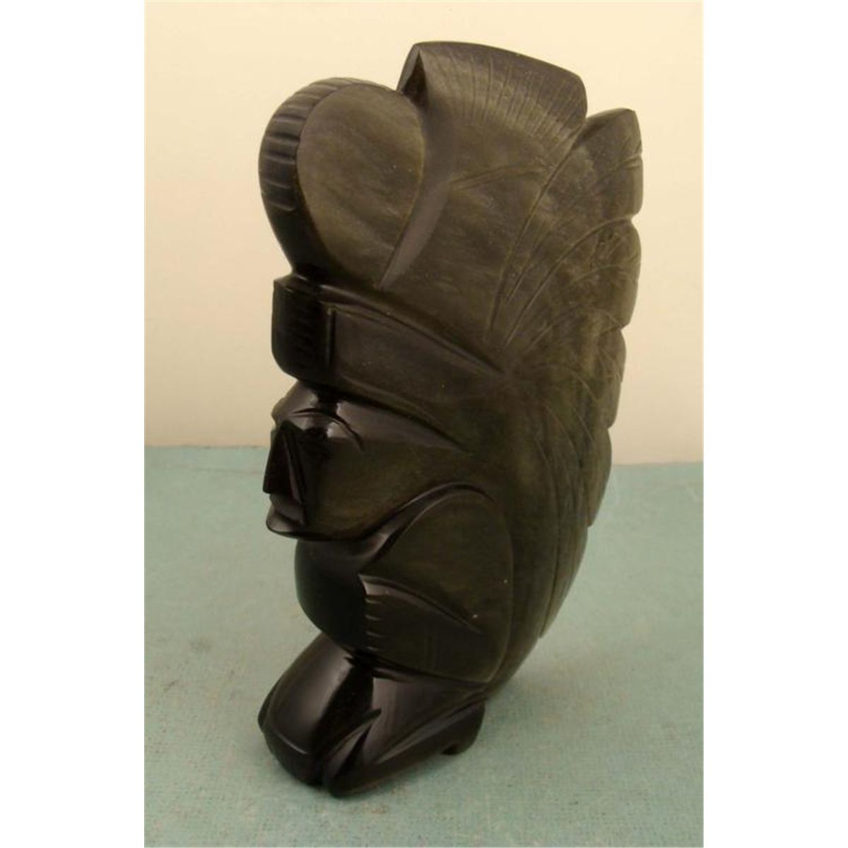 This Native American figurine was hand-carved out of a deep gray green stone, probably marble. The form has an exaggerated, large feather headdress, and the figure is kneeling. The surface of the stone has a nice sheen . The size is 5" x 7 1/2". It is not signed or marked. The condition is excellent. * This sculpture has a traditional subject and a somewhat modern form.