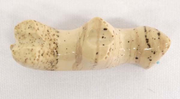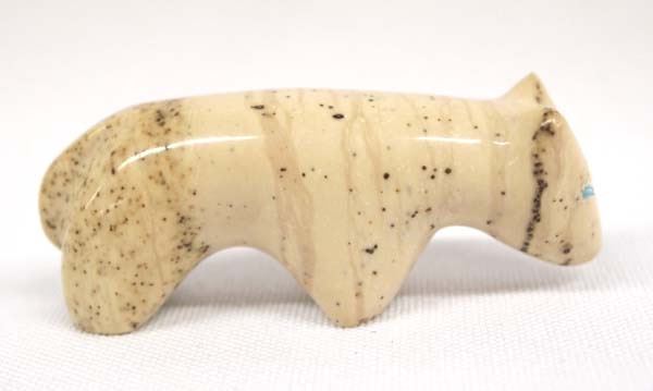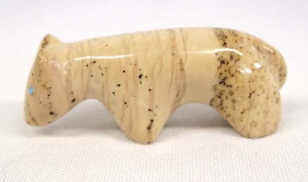 Native American Hand Carved Dolomite Zuni Bear Fetish, measures 1'' x 2'', turquoise eyes