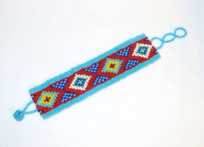 For your consideration is this wonderful vintage hand beaded Native American bracelet in wonderful vintage condition. This beautiful example of vintage Native American art features turquoise and coral color beads hand woven into intricate patterns. Outstanding and unique piece of wearable art. The bracelet is adjustable and measures about 7" inside.