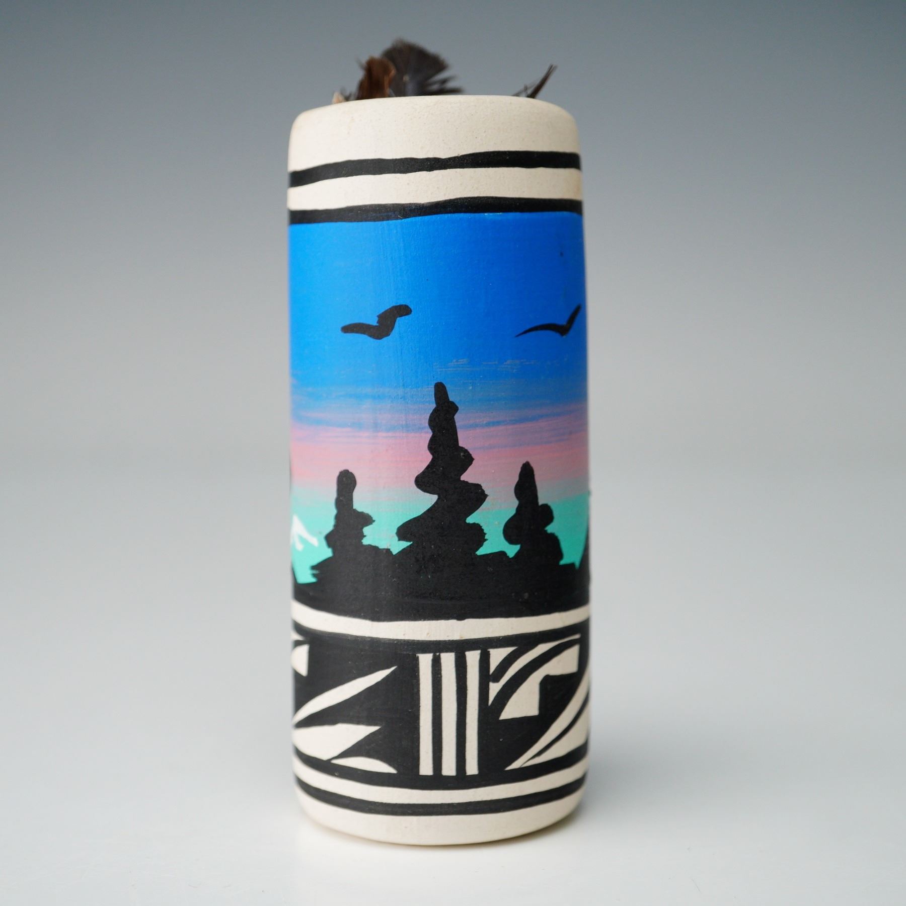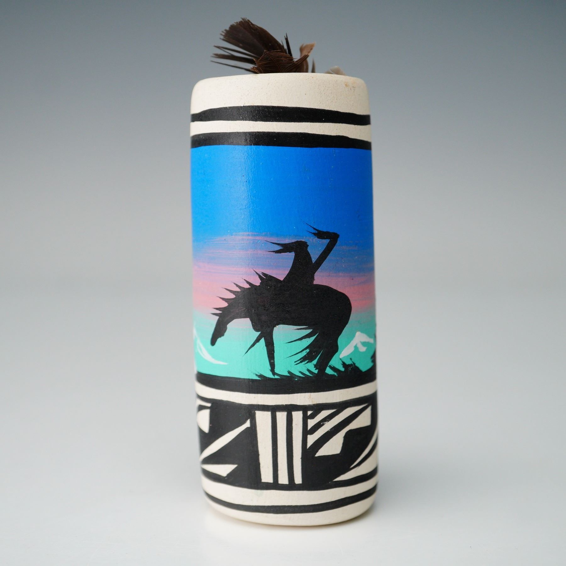 Hand-painted cylindrical pottery vase decorated with vivid gradient bands of blue, pink, and green, accented with bold black silhouetted scenes of tipis, riders on horseback, and soaring birds. The base features traditional geometric patterns in black and white. The vase is adorned with natural feathers, adding a further cultural dimension to the piece. A striking decorative example blending modern colorwork with traditional motifs.