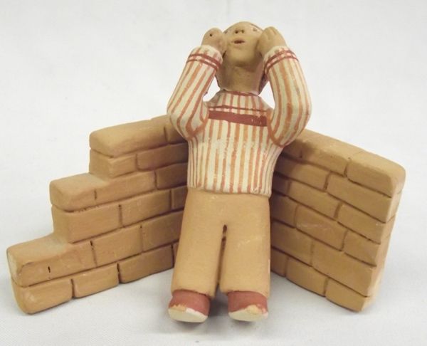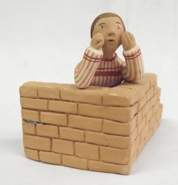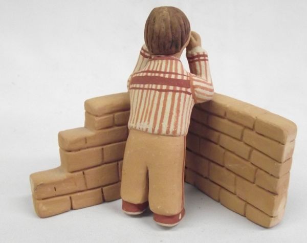 Native American ''Hide and Seek'' Folk Art Pottery signed by ''J. S. G.'' on figure's foot, young boy playing hide and seek calling ''olly olly oxen free'' while standing up against fence, boy measures approx. 3.5''H and brick wall measures 3''H x 3.75'' on long side, fence has been repaired.