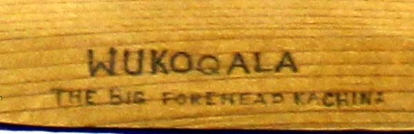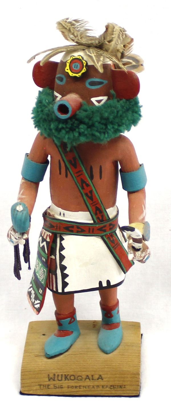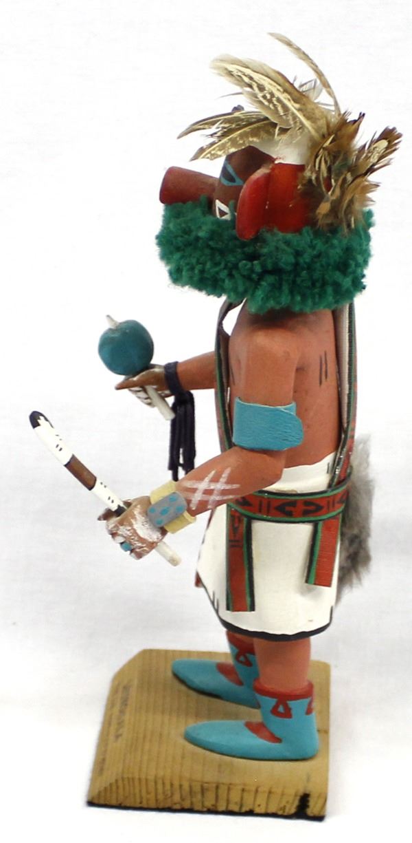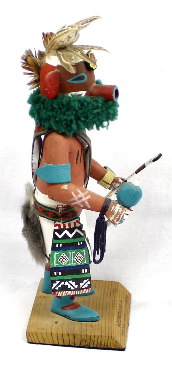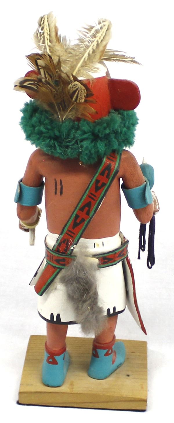 Native American Hopi Big Forehead Kachina, measures 4'' x 10'' x 5'', embellished with feathers, yarn, painted cloth, rabbit fur, and leather, carrying a rattle and rabbit stick
