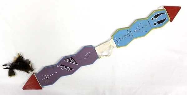 Native American Hopi Carved Wood Dance Wand, measures 3.5''W x 33''L, hand painted and embellished with feathers