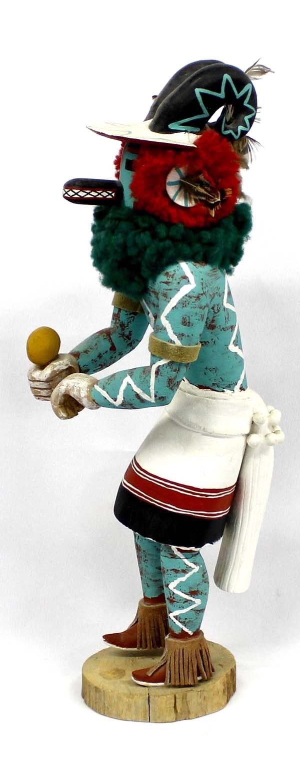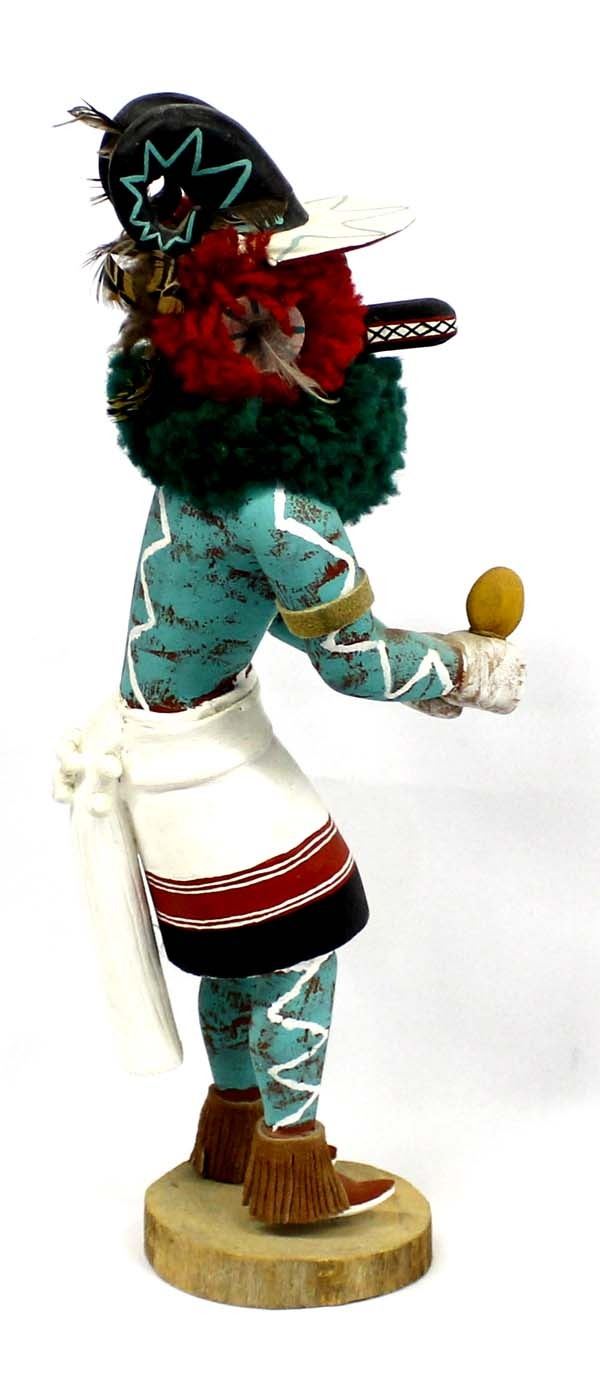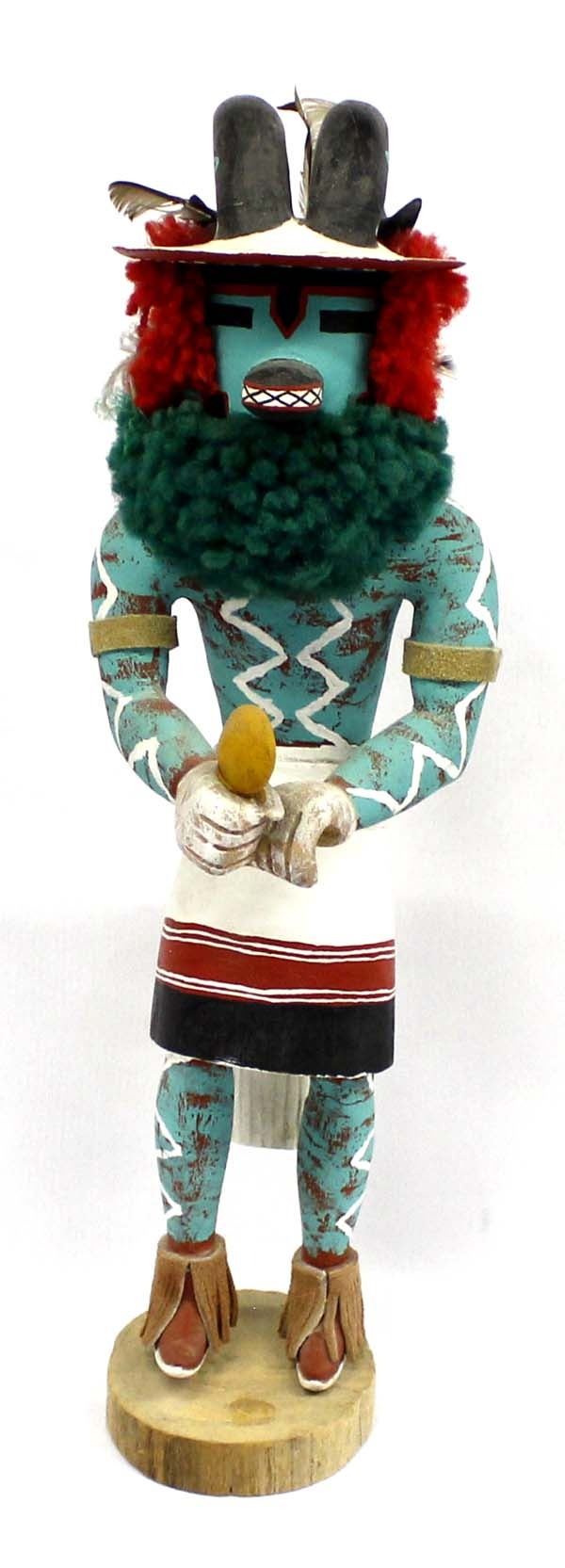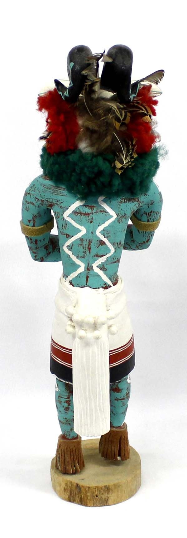 Native American Hopi Carved Wood Ram Kachina, measures 5'' x 16''H x 5'', one of the horns has been glued, embellished with yarn, feathers, and leather, beautifully painted and carved, ''The Ram Kachina is a rare kachina, that only appears in the Kiva or night dances held in late February through March. He is the bringer of snow or more moisture to the Hopi Lands.''