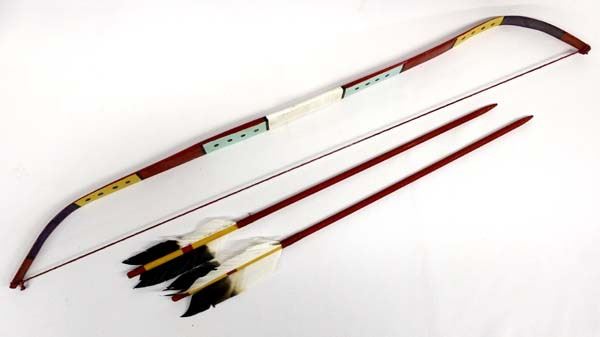 Native American Hopi Child's Bow and Arrows, bow measures 3.5'' x 31''L, beautiful bright colors