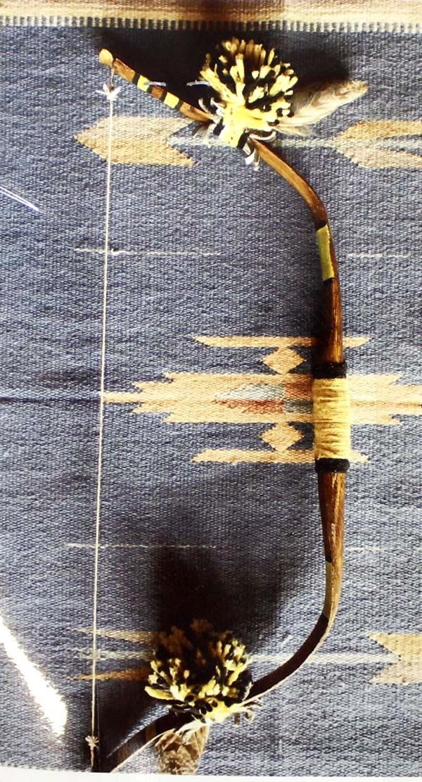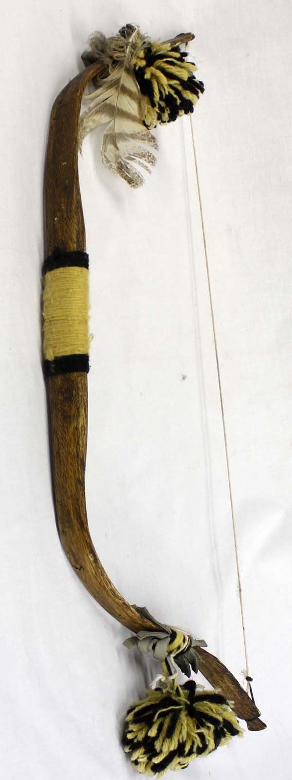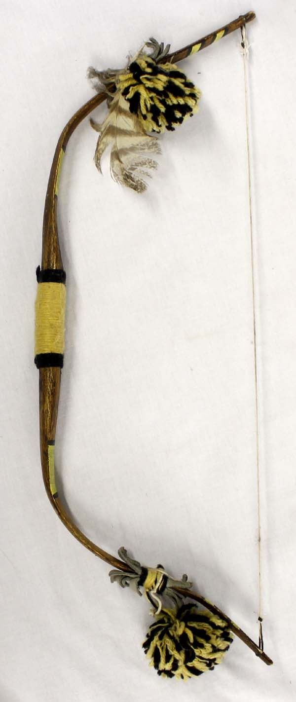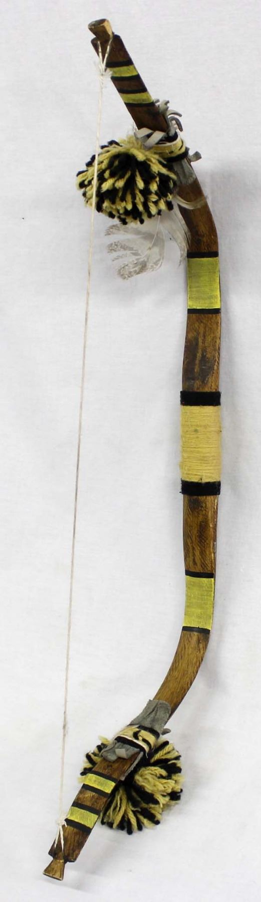 Native American Hopi Child's Bow, measures 23''L x 7.5''W, hand painted yellow and black lines, embellished with yellow and black pom poms, single feather, yarn, and leather