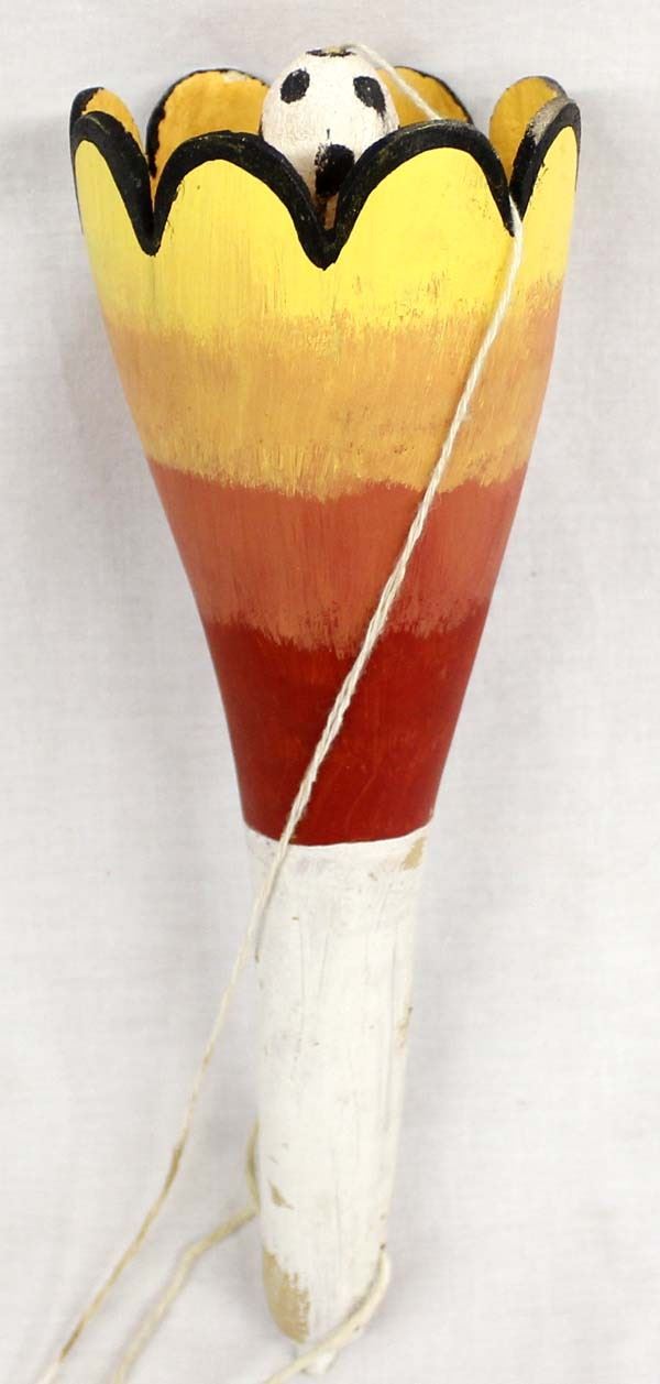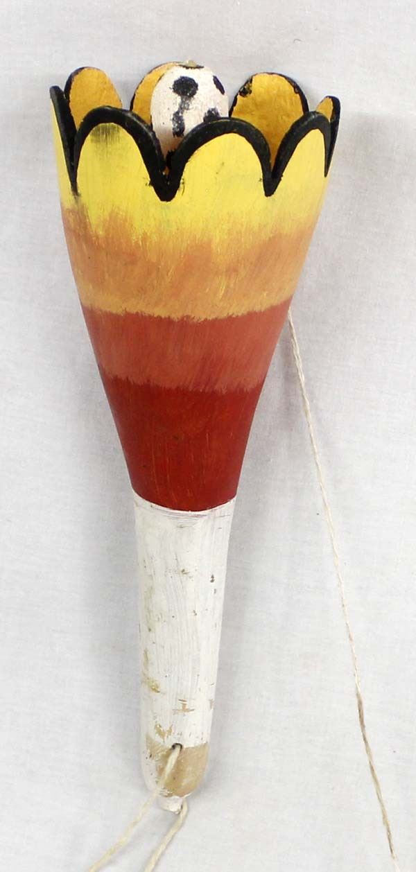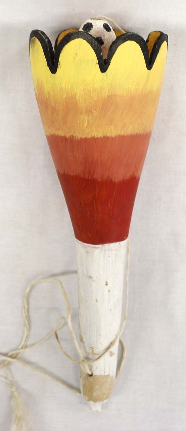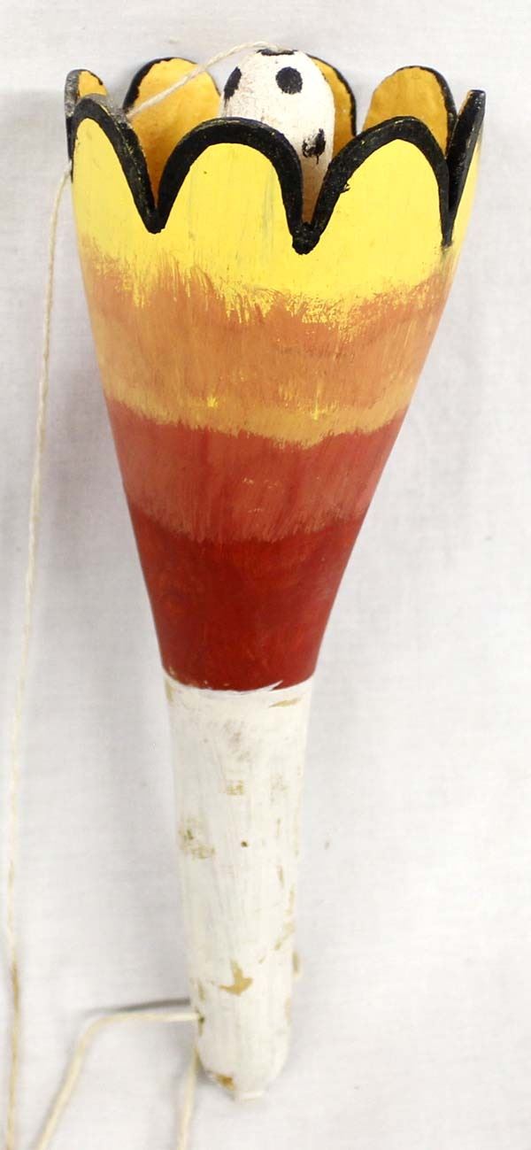 Native American Hopi Flower Dance Wand, measures 10''L x 3.5''W, embellished with feather, inside of flower has cotton stuffed inside