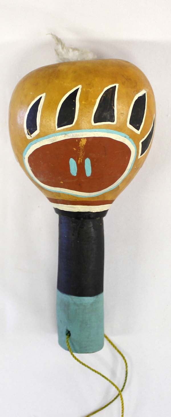 Native American Hopi Gourd Dance Rattle, measures 8.5'' x 4'', hand painted bear and bear paw designs, wood handle
