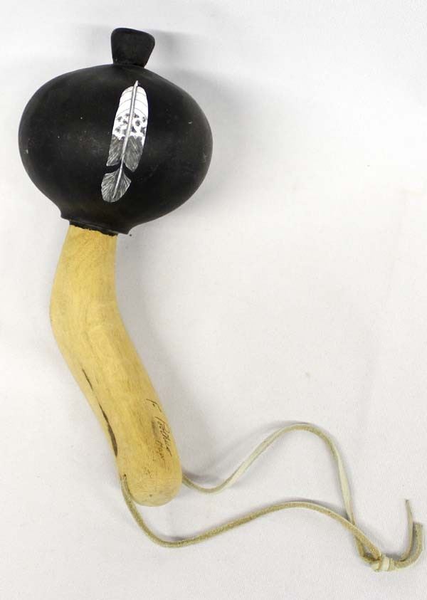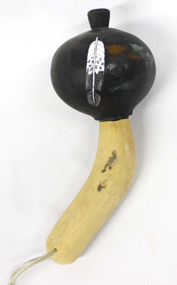 Native American Hopi Hand Painted Gourd Rattle by Frank Poolheco, measures 10''L x 4''D and signed by the artist on the handle, feather motif, FYI: ''Frank is a registered member of the Hopi tribe from the Tewa village and he found his strong artistic inspiration from his father (kachina/gourd work) and mother (pottery/painter) He creates each piece with natural color and shape and all work is signed F. Poolheco Hopi-Tewa and a spider. The spider represents his clan membership.''