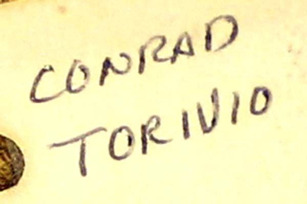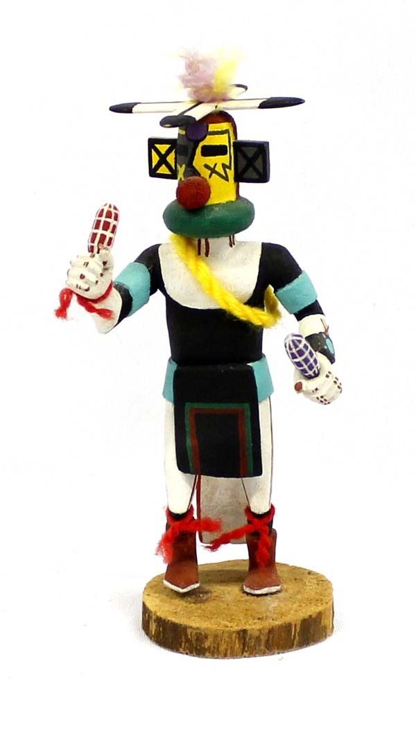 Native American Hopi Corn Dancer Kachina by Conrad Torivio, measures 6'' x 3'', embellished with yarn and feathers, FYI: ''Conrad is from Shungopavi or Second Mesa and has been carving Kachina's since the mid 1980's.''